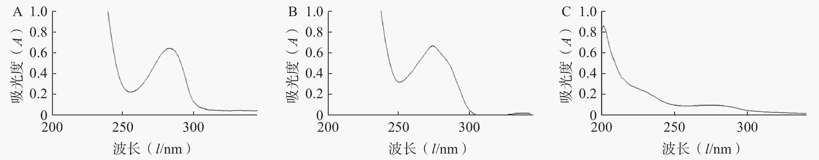 • 通过总生物碱在282 nm的特征吸收峰,得线性回归方程:Y=0.013 3X−0.001 4(r=0.999),供试品溶液吸光度代入计算,莲子心总生物碱中生物碱含量为60.56%,莲子心总提物中生物碱含量占10.16%,莲子总生物碱曲线未见明显吸收峰(图2),说明莲子中生物碱含量极低。推测生物碱类成分含量的差异可能是引起两者生物活性不同的主要原因。
