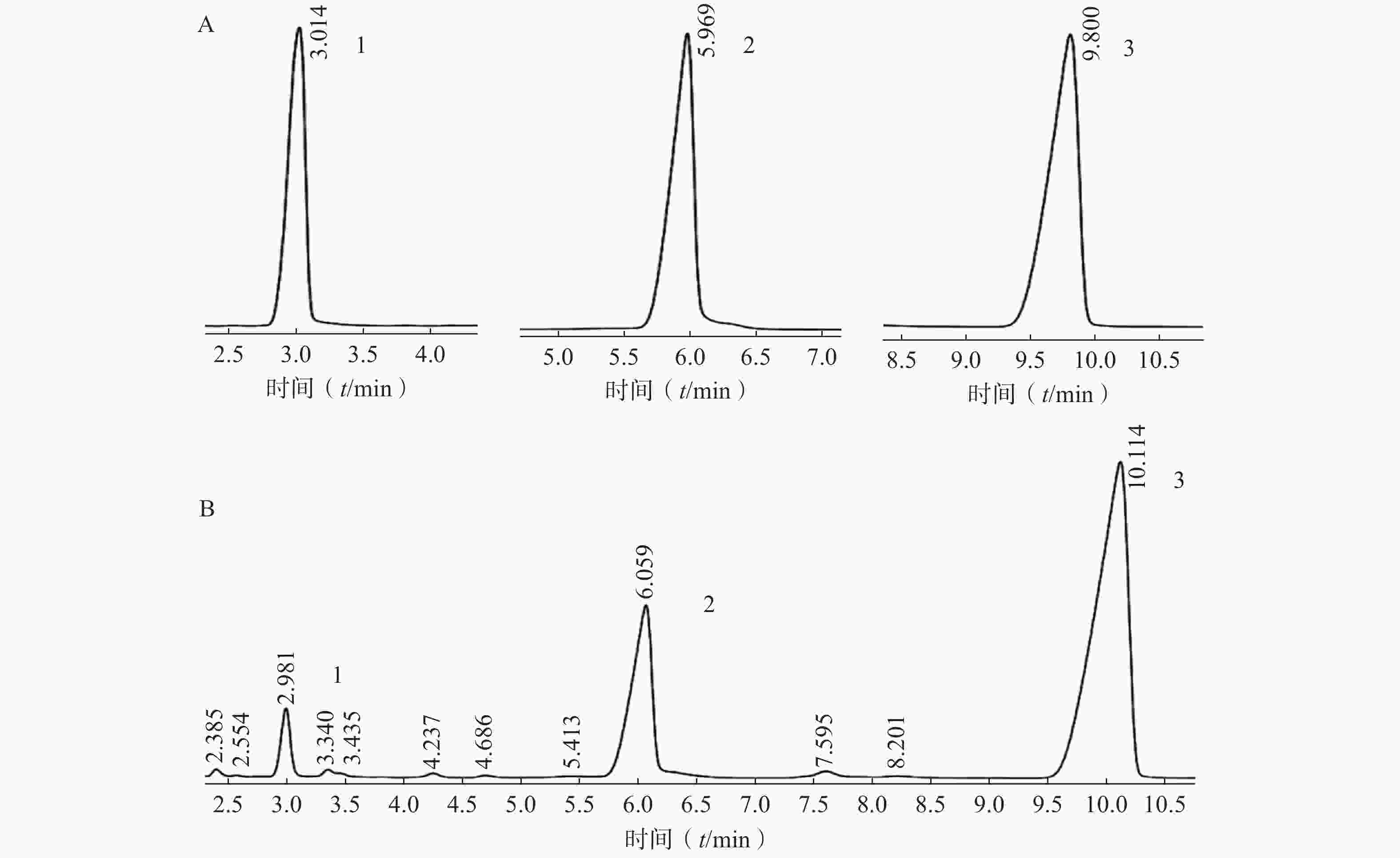 A. 生物碱对照品;B. 莲子心总生物碱样品1.莲心碱; 2.异莲心碱; 3.甲基莲心碱
