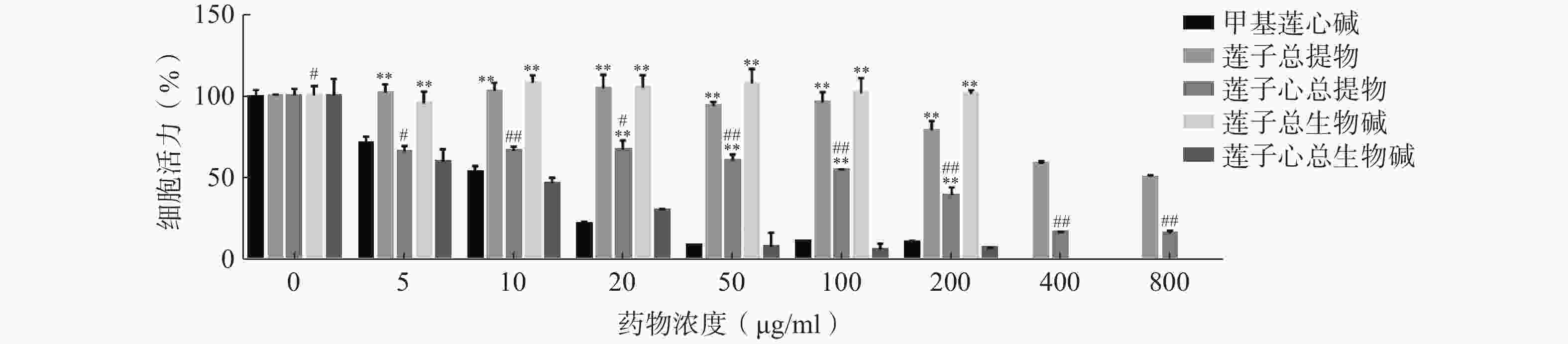 莲子总提物、莲子心总提物母液配制同上,DMEM培养基稀释为8 mg/ml工作液,实验前稀释成5、10、20、50、100、200、400、800 μg/ml的待测液[17-19],设置空白对照组。