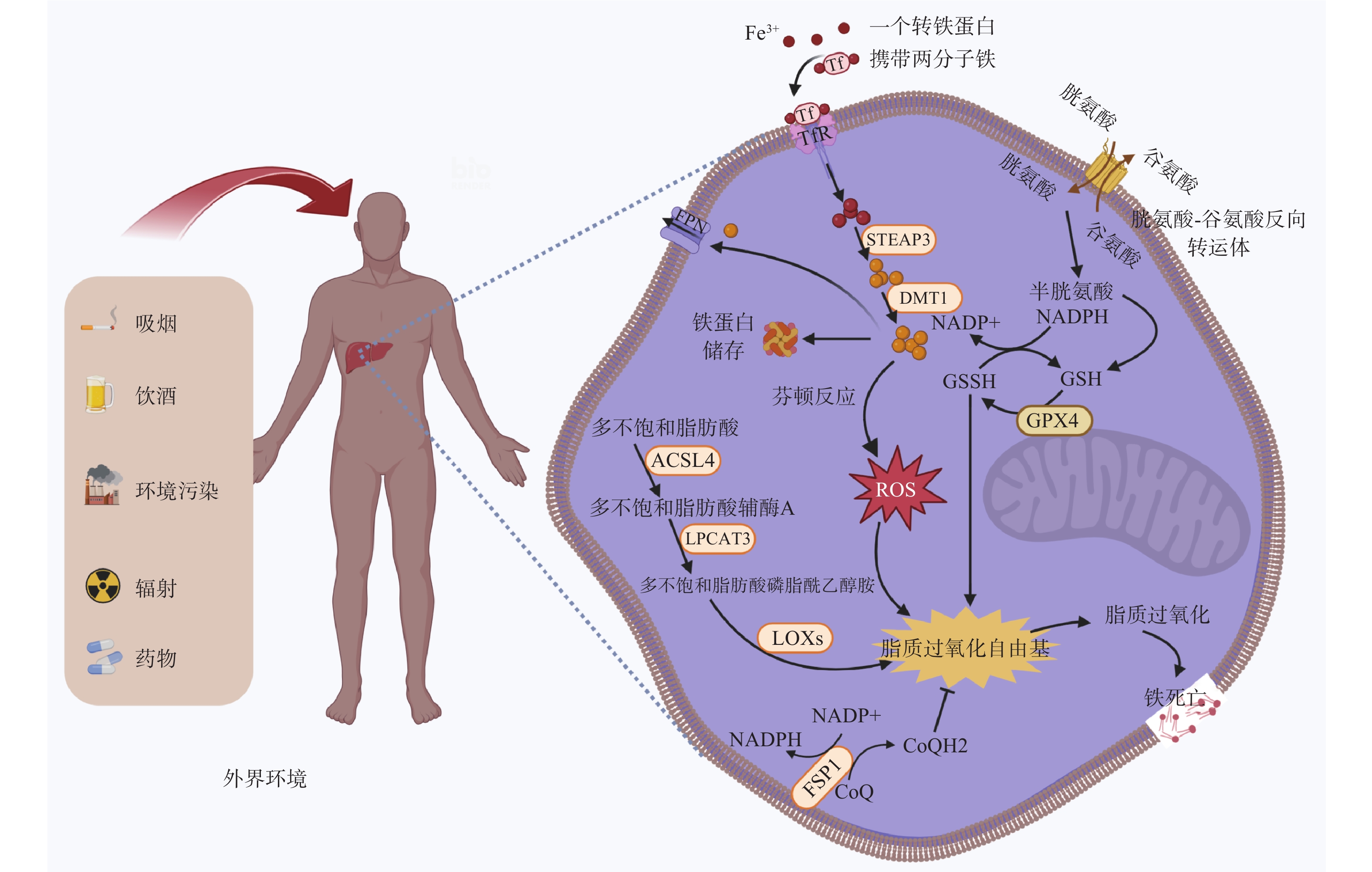 机体通过氧化还原反应来保障自身正常生理功能,该反应发生依赖氧气与过渡金属铁离子,这个过程中不可避免产生ROS副产物,其中包含磷脂氢过氧化物(PL-OOH,基于脂质的ROS形式)。谷胱甘肽过氧化物酶4(GPX4)是主要的PL-OOH中和酶,它介导谷胱甘肽(GSH)转化为氧化型谷胱甘肽(GSSG),并将PL-OOH还原生成相应的醇类(PL-OH)[2]。当细胞内PL-OOH水平超过一定阈值时,细胞将发生铁死亡。铁死亡是一种依赖于铁的独特的新型细胞程序性死亡,这种铁依赖性调节细胞死亡的特征就是不受控制的脂质过氧化介导的大量膜损伤[3]。