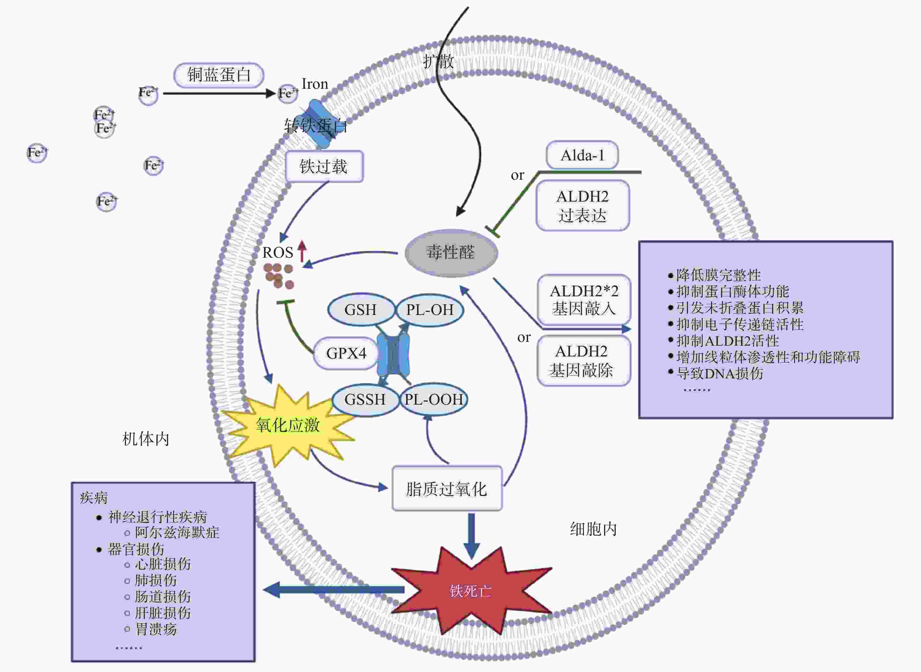 根据来源不同,机体内的醛分为内源性醛和外源性醛,外源性醛通过扩散进入细胞,与内源性醛共同作用产生ROS,大量的ROS生成使其在细胞中的含量超过了细胞抗氧化防御系统的缓冲能力,导致细胞进入氧化应激状态,此时若无法及时消耗多余的ROS,细胞将发生脂质过氧化,从而使细胞铁死亡。ALDH2与GPX4是细胞毒性醛消耗过程以及抗氧化防御过程的重要酶,两者都能通过毒性醛—ROS—氧化应激—脂质过氧化循环调控细胞铁死亡。ALDH2突变使该酶的活性急剧下降,无法及时消耗毒性醛,导致细胞出现铁死亡,ALDH2小分子激动剂Alda-1能消除或缓解这种影响。