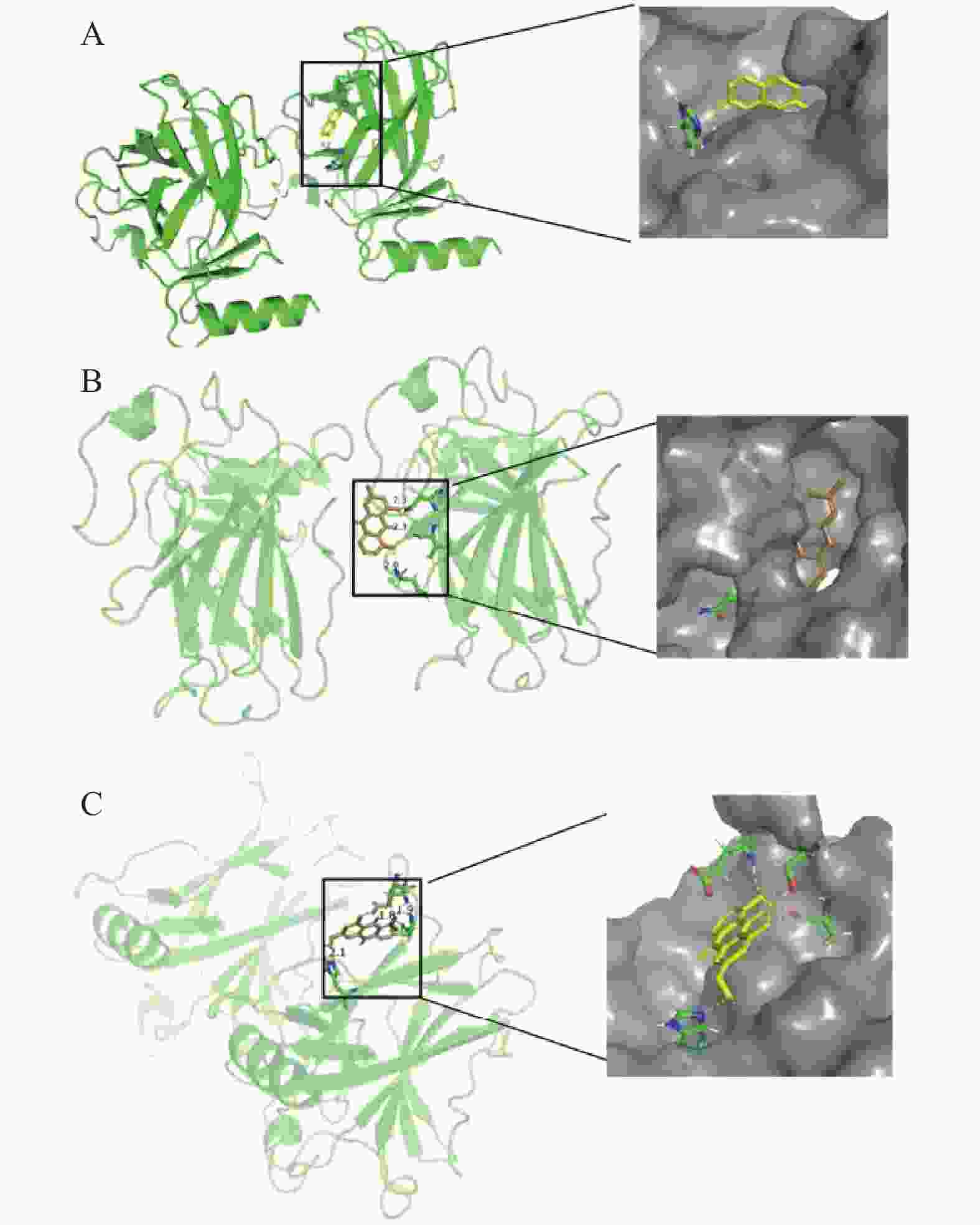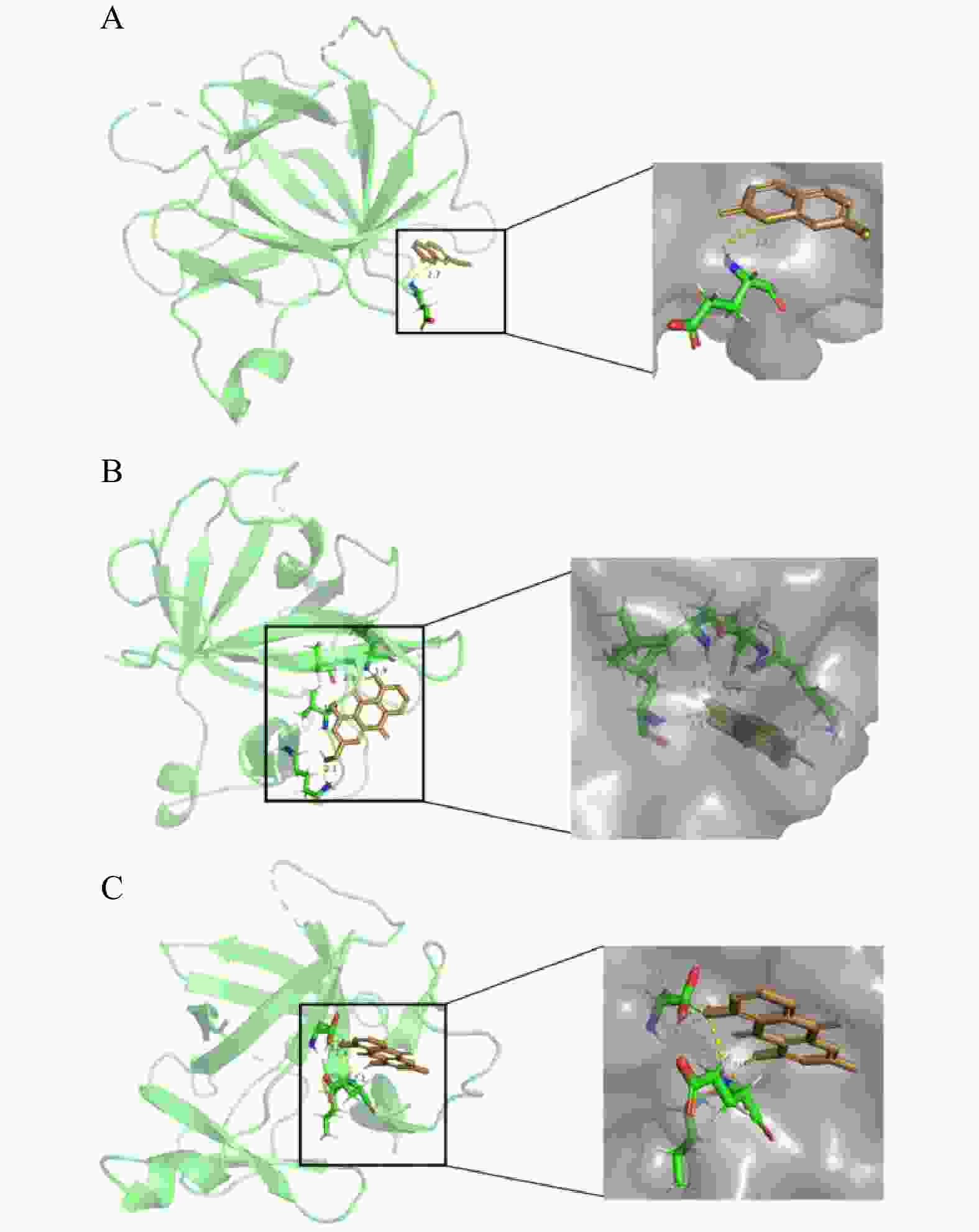 A.ERBB2-7-甲氧基香豆素分子对接; B.ERBB2-芦荟大黄素分子对接; C.ERBB2-大黄酚分子对接