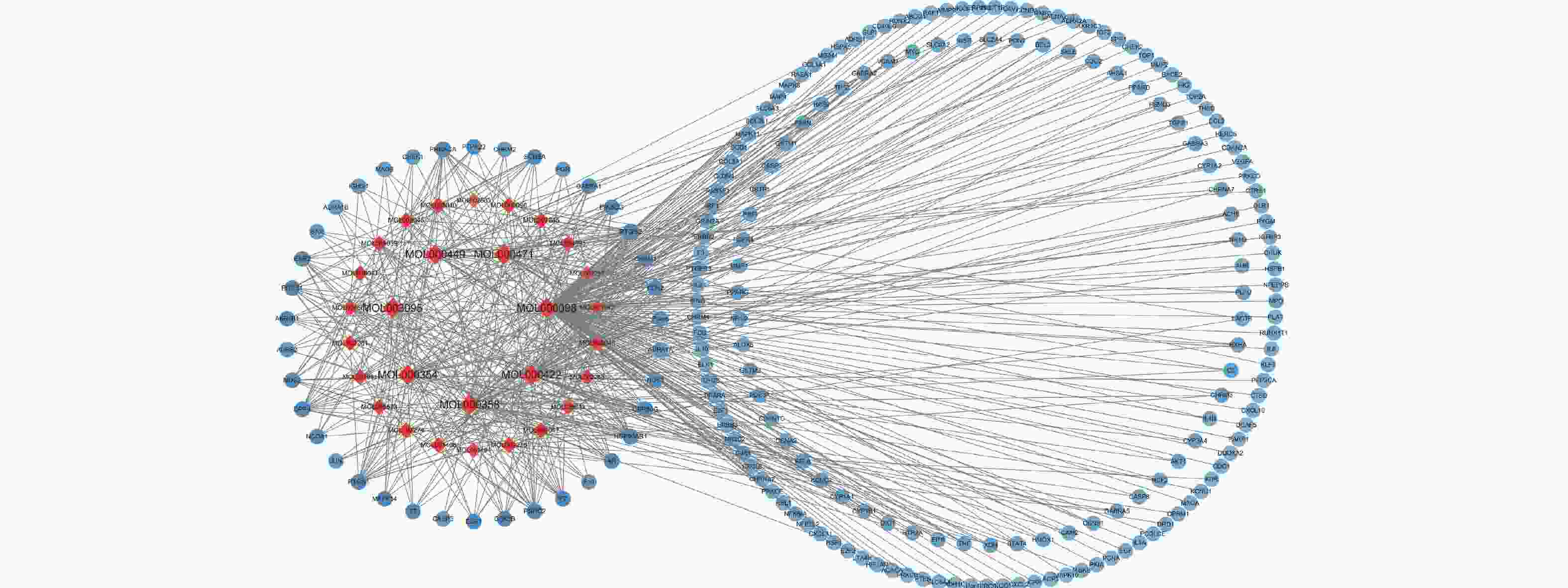 根据高通量对接得到的茵陈蒿汤活性化合物靶标信息,构建“成分-靶标”网络,直观地表现中药复方“多成分-多靶标”的作用特点,揭示复方配伍起效的机制。构建的网络图如图2所示,该图包含244个节点:红色代表茵陈蒿汤关键成分,蓝色代表茵陈蒿汤主要作用靶点。