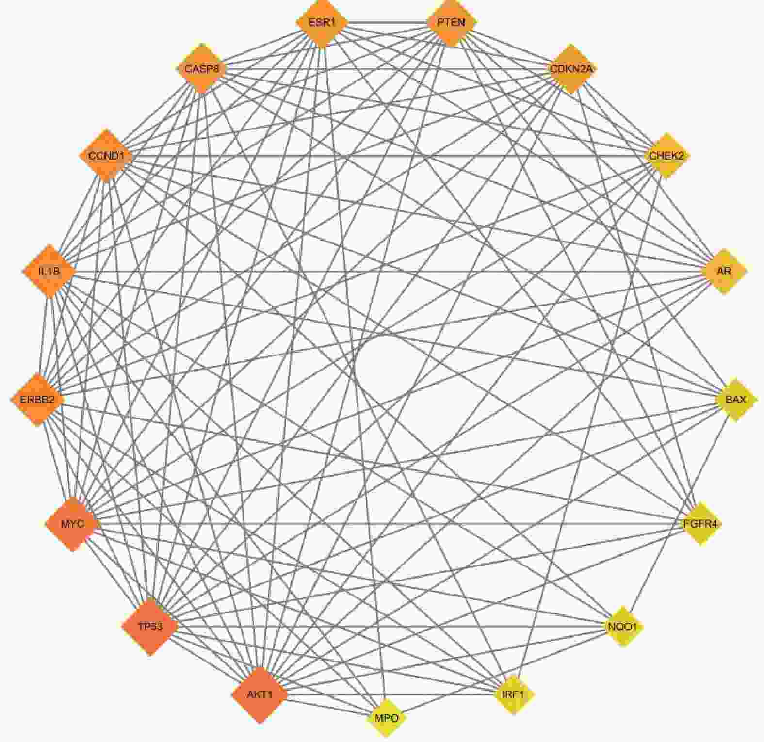 • 利用在线Venn2.1 分析工具获得茵陈蒿汤成分的靶点和肝癌靶点的交集,并绘制Venn图(图3)。交集靶点信息具体见表2。将交集靶点输入 String网站,将其数据文件导入Cytoscape软件,最终得到其PPI网络图(图4),Degree值越大节点越大。筛选出Degree值排前五位的靶点,分别为AKT1、TP53、表皮生长因子受体2(receptortyrosine-protein kinase erbb-2,ERBB2)、骨髓细胞瘤癌基因(myelocytomatosis oncogene,MYC)、白介素-1β(interleukin-1β,IL-1β),并认为这是茵陈蒿汤作用的关键靶点。