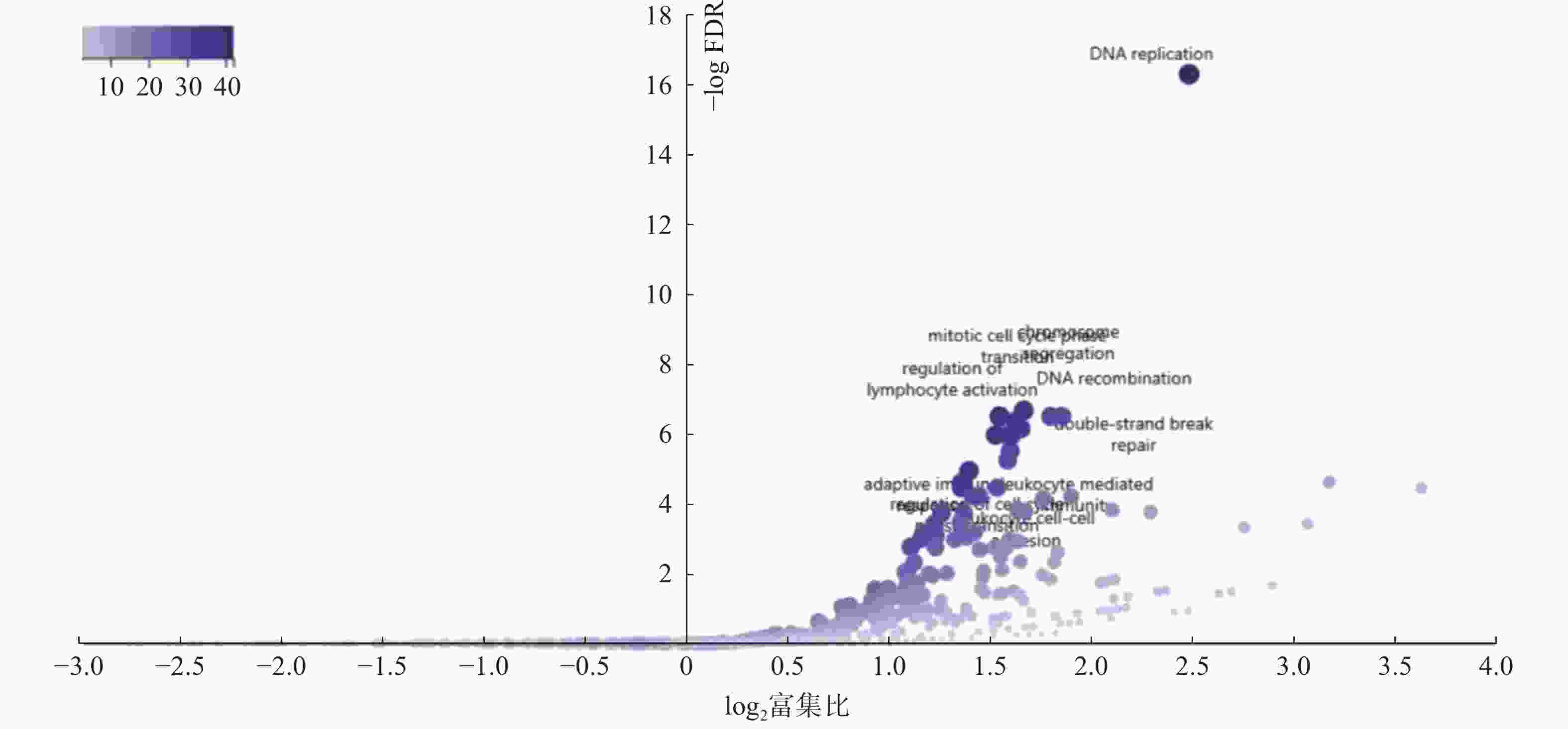 注:图中的点代表不同的GO富集通路,点的颜色深浅反映该GO富集通路中基因的数量,颜色越深表示基因数量越多。