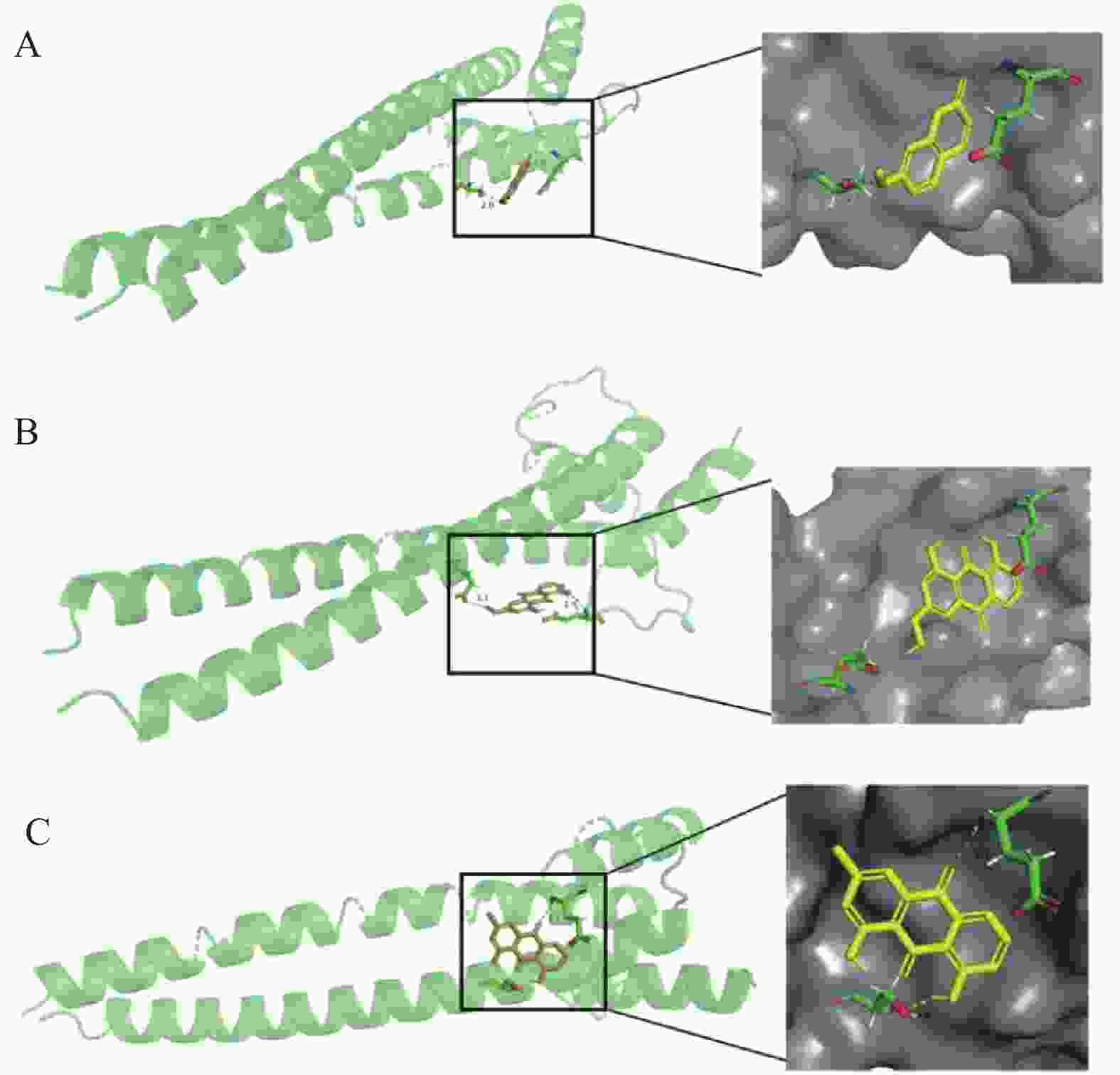A.MYC-7-甲氧基香豆素分子对接; B.MYC-芦荟大黄素分子对接; C.MYC-大黄酚分子对接