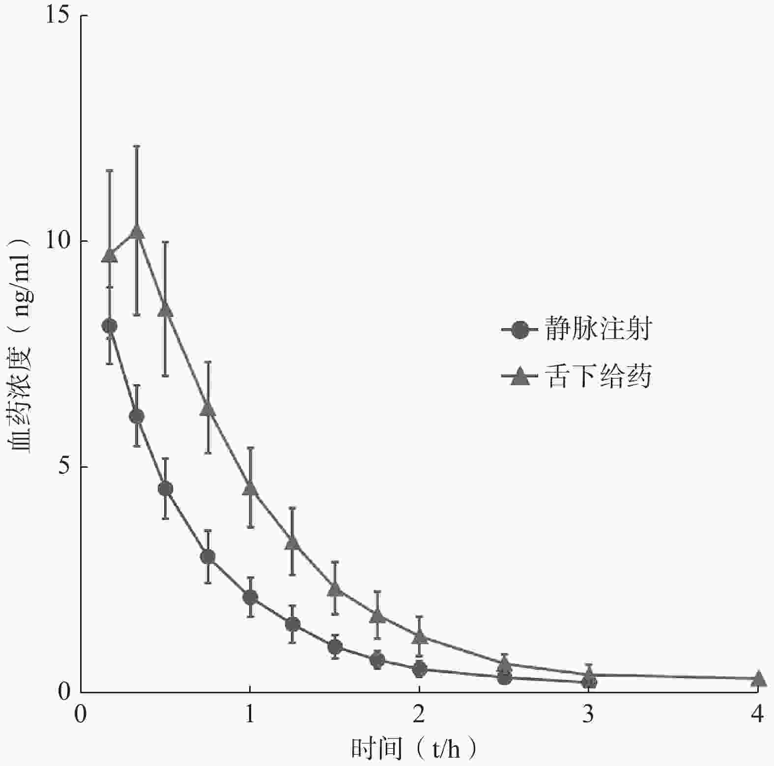 图  1  氟马西尼静注和舌下喷雾给药的血药浓度-时间曲线图