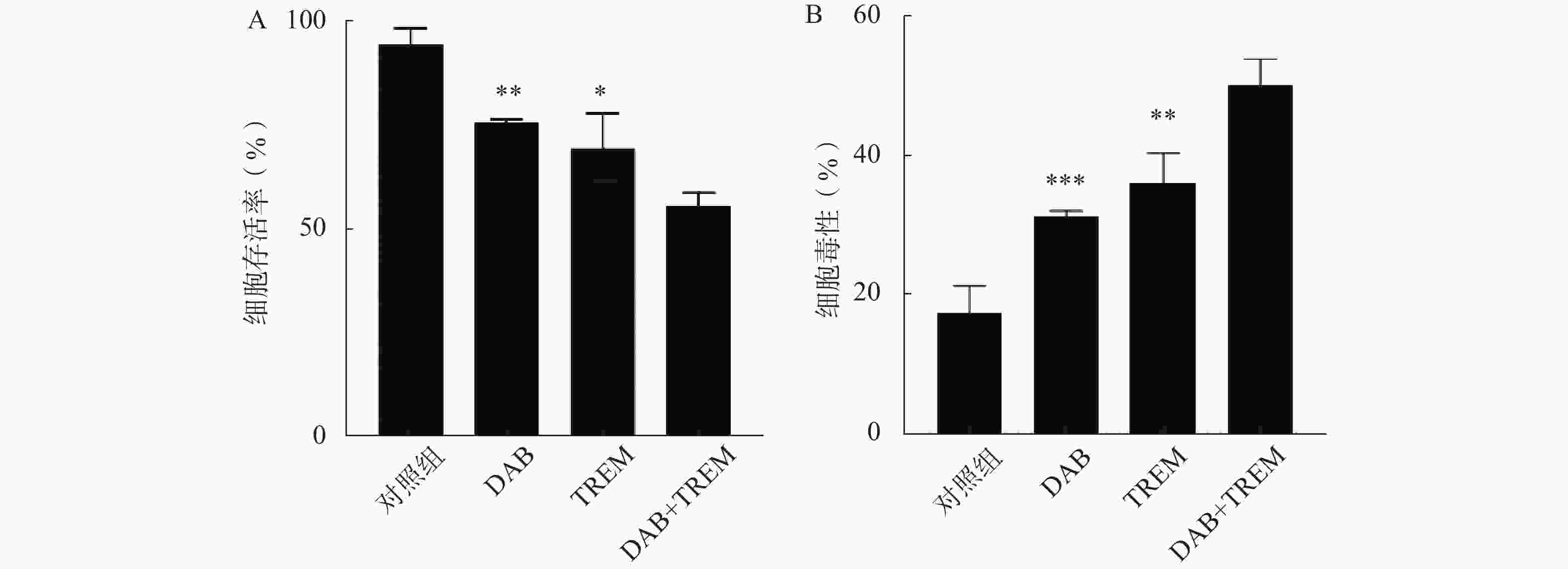 • DAB(批号:HY-14660)、TREM(批号:HY-B0380)(美国MCE公司);胎牛血清(FBS)(美国Gibco公司);胰蛋白酶、青霉素-链霉素(上海索莱宝公司);CCK-8、ROS、SOD和MDA检测试剂盒(上海碧云天生物科技公司);乳酸脱氢酶(LDH)、ATP检测试剂盒(南京建成生物科技公司);抗PCNA的抗体(武汉三鹰生物科技公司);荧光过氧化物酶 FITC 标记的二抗(美国Thermo Fisher Scientific公司);酶标仪(型号:Multiskan skyHigh,Thermo Fisherg公司);倒置显微镜(型号:DMi1,Leica公司);分光光度计(型号:Genesys 10S UV-Vis,Thermo Scientific公司)。