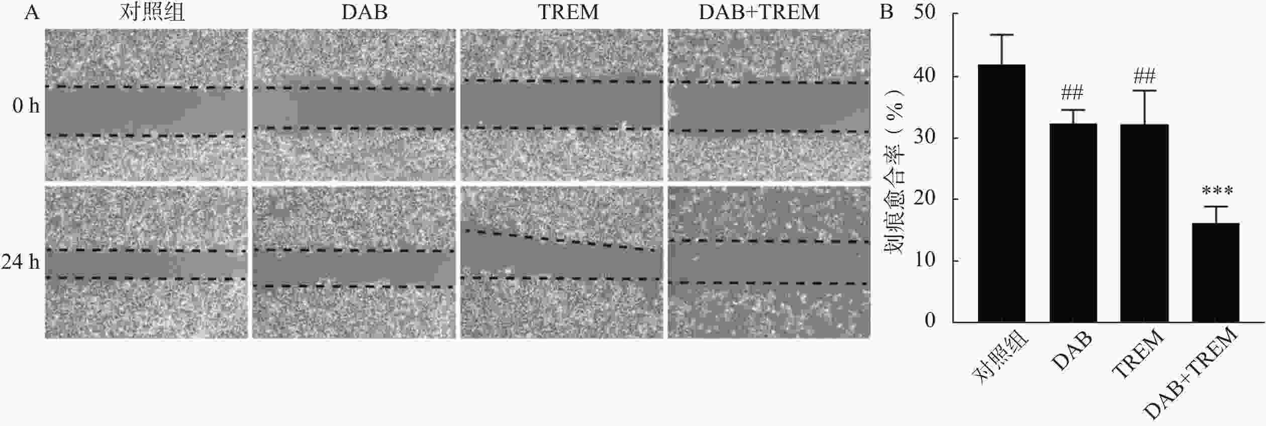 • 将对数生长期的A375细胞(1.0×105个/孔)接种于6孔板中,待细胞贴壁生长至整个底部时,使用200 μl无菌移液枪枪头在板表面划出一条等宽的线,用PBS洗涤2次去除划痕区域的细胞碎片。分别加入DAB(1 μmol/L)、TREM(5 μg/ml)和DAB(1 μmol/L)+TREM(5 μg/ml),并设置溶剂对照组,继续培养24 h。在划痕后0、24 h于倒置显微镜下观察并拍摄划痕区域,使用Image J软件定量分析划痕宽度的变化,并计算划痕愈合率:划痕愈合率(%)=(0 h划痕宽度–24 h划痕宽度)/0 h划痕宽度×100%。