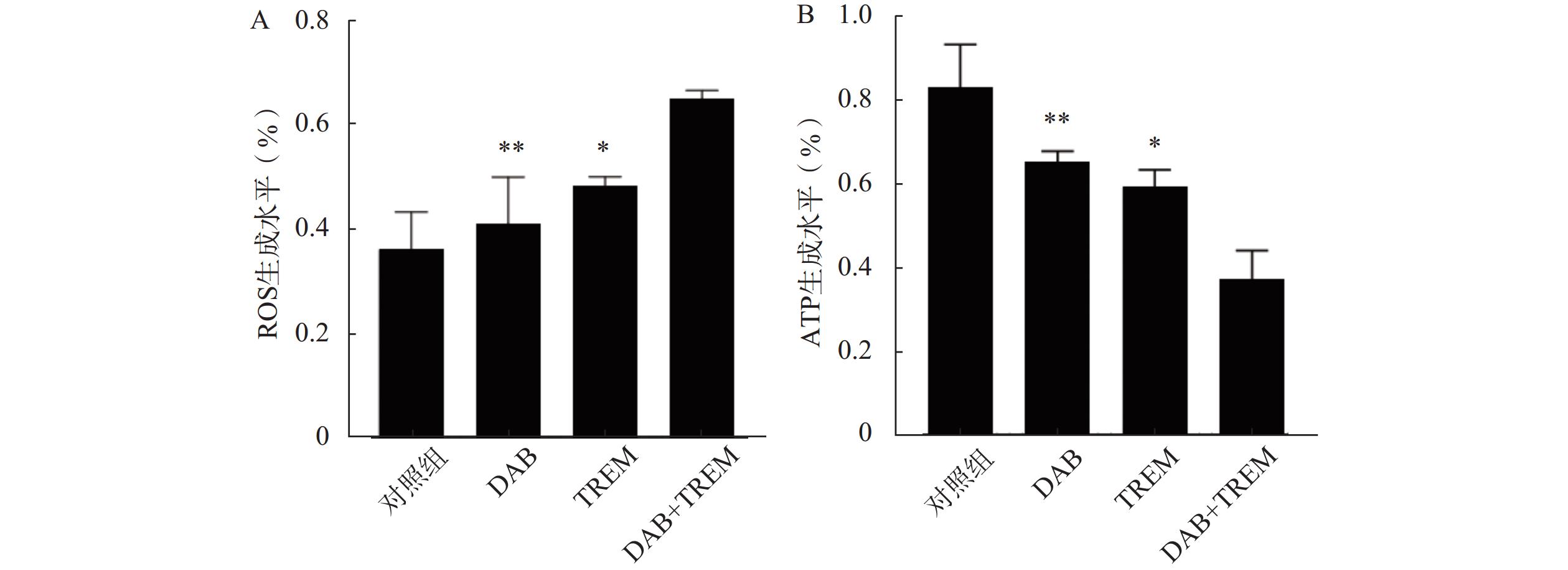 图3B所示,与对照组相比,单独给药组及联合给药组的ATP水平均显著降低,且联合用药组的ATP水平显著低于单独给药组。结果表明,DAB联合TREM可能通过抑制细胞的能量代谢而增强抗肿瘤作用。