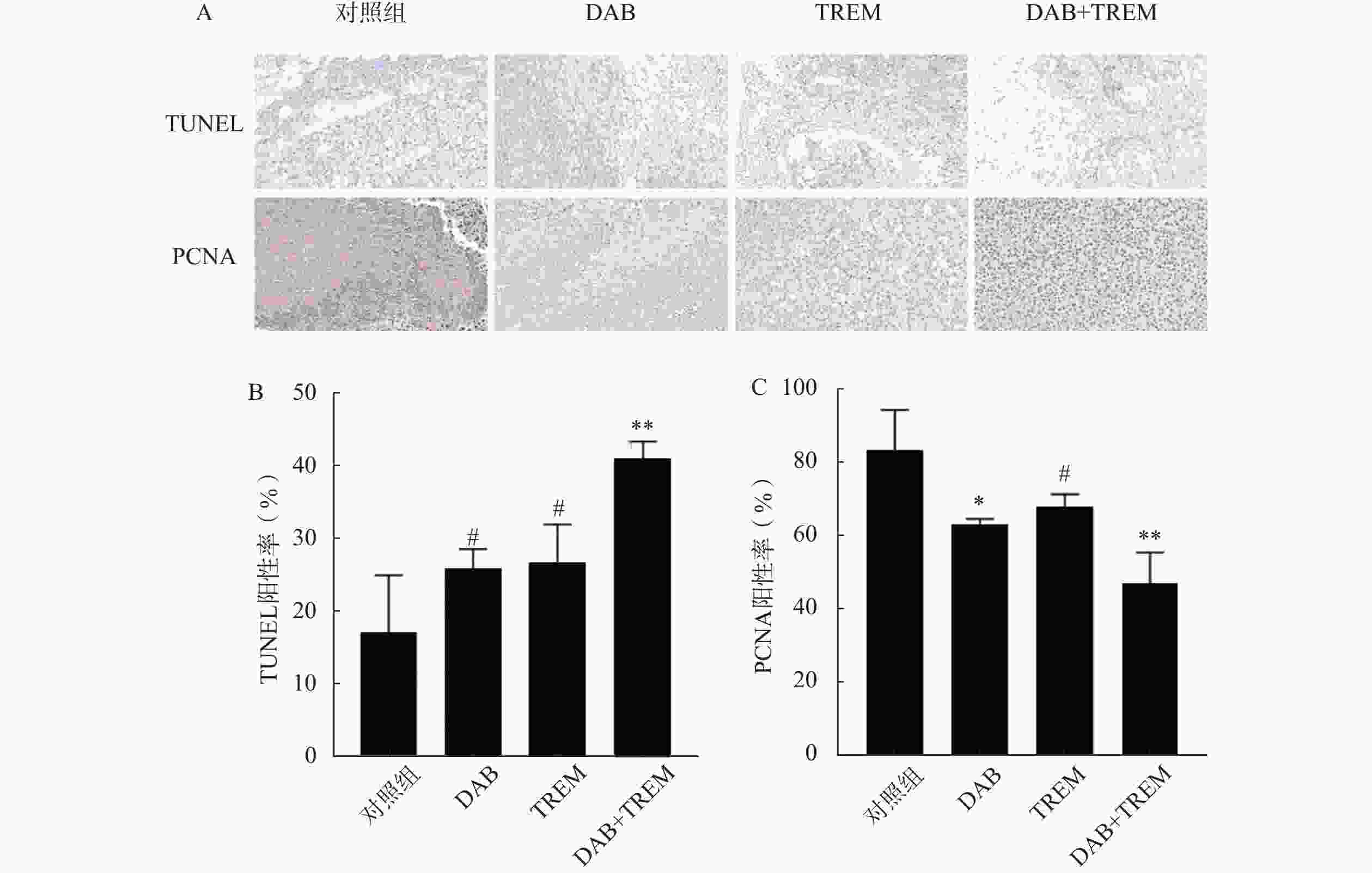 通过检测肿瘤组织内PCNA蛋白的表达,评价各组肿瘤组织细胞增殖情况。结果如图6A6B所示,与对照组相比,单独给药组及联合给药组的PCNA阳性率均降低,分别为(83.091±11.00)%、(63.31±1.31)%、(68.00±3.25)%和(47.05±8.48)%。其中,联合给药组的PCNA阳性率降低最显著,提示DAB联合TREM显著抑制细胞增殖。综上,DAB联合TREM可能通过增强细胞凋亡及抑制细胞增殖而发挥更强的抗肿瘤效果。