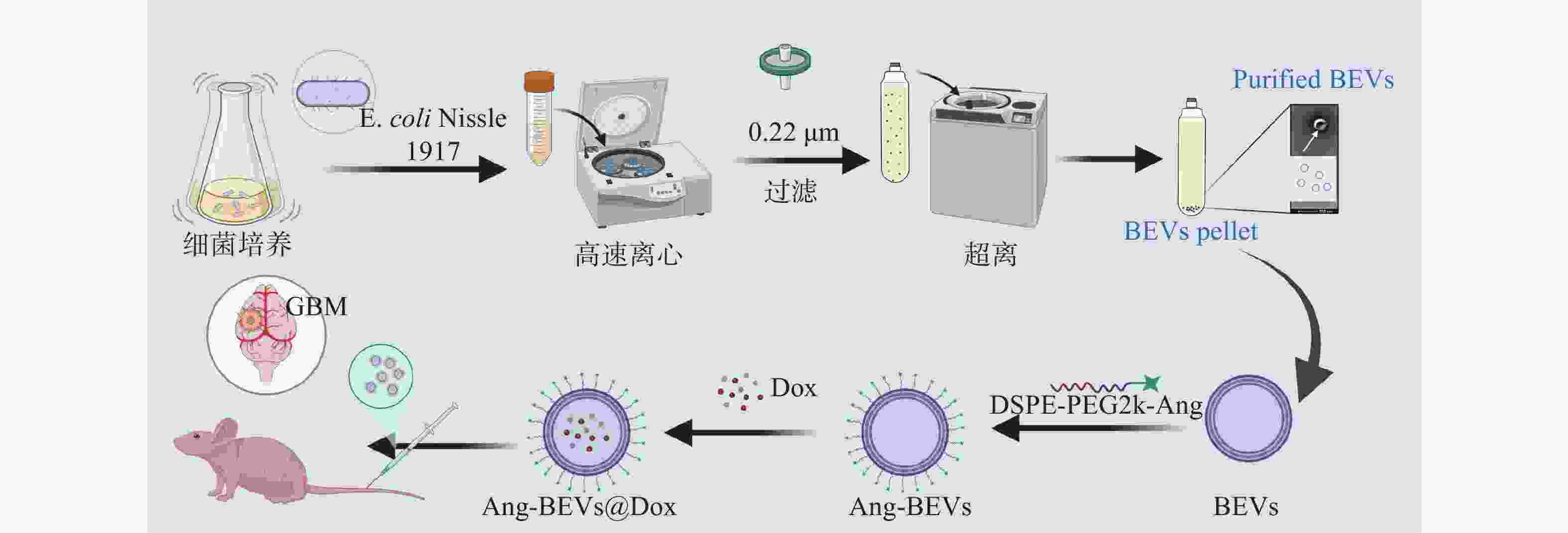 细胞外囊泡(EVs)是细胞之间通讯的重要工具,具有天然的纳米级尺寸、良好的生物相容性和低免疫原性等优势,是一种良好的药物递送平台[6]。而细菌外囊泡(BEVs)是细菌分泌的天然囊泡,已经被证明是细菌和宿主之间传递通讯信号的通信介质,具有独特的性质和功能[7]。与哺乳动物来源的EVs相比,BEVs具有来源广泛、易于工程化改造、可以大规模生产等优点,在中枢神经系统疾病以及GBM的治疗应用中具有巨大潜力[8]。此外,BEVs中还具有许多免疫刺激因子,能抑制改变肿瘤的微环境并抑制肿瘤细胞的生长[4]E. coli Nissle 1917(ECN)是一种肠道益生菌,不携带致病因子,其分泌的BEVs常被应用于药物递送的载体[9-10]