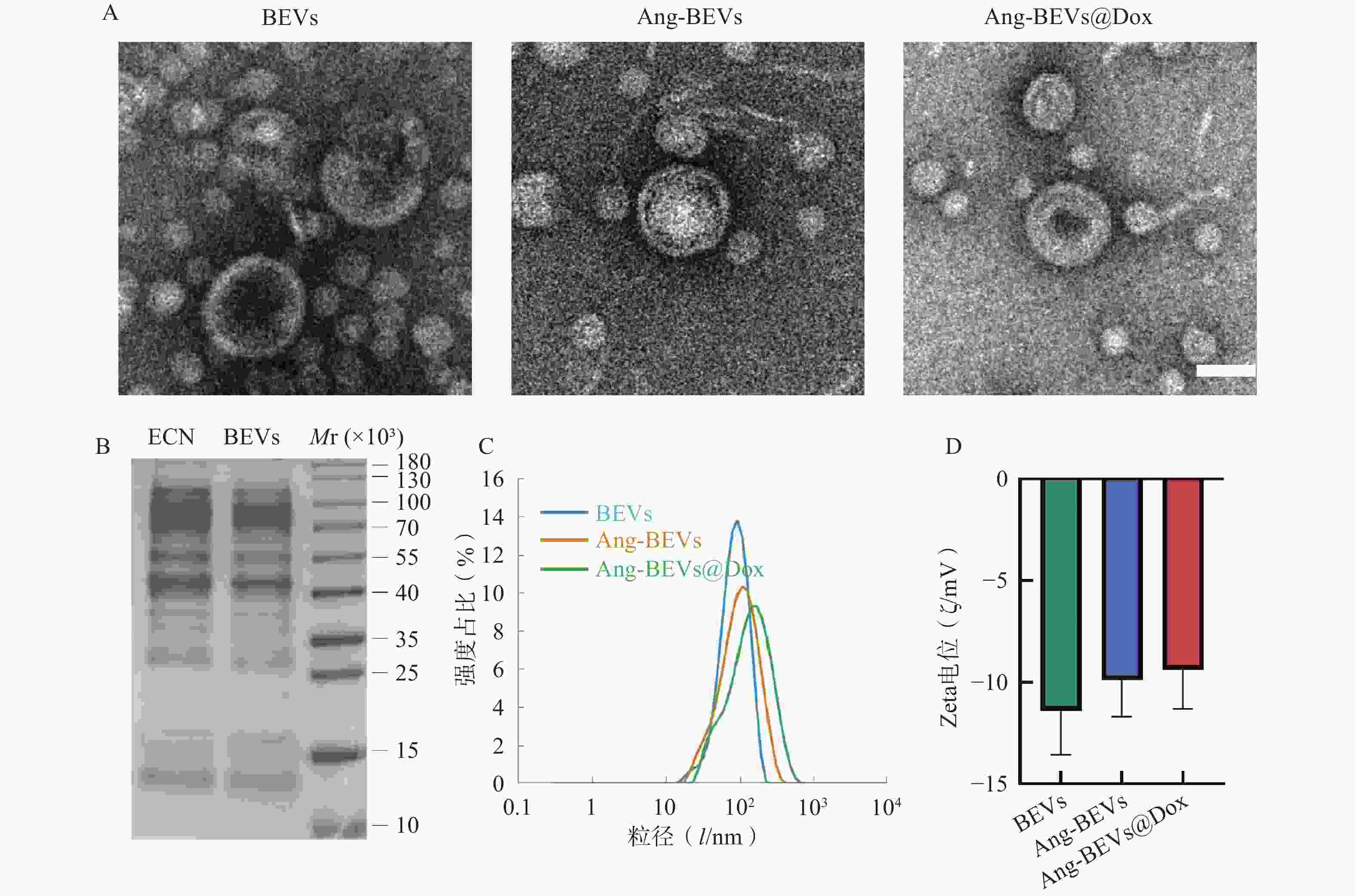 A. 不同组BEVs的电镜图像(标尺=100 nm);B. BEVs与ECN裂解产物SDS凝胶电泳蛋白图谱;C. DLS检测粒径分布;D. Zeta电位变化