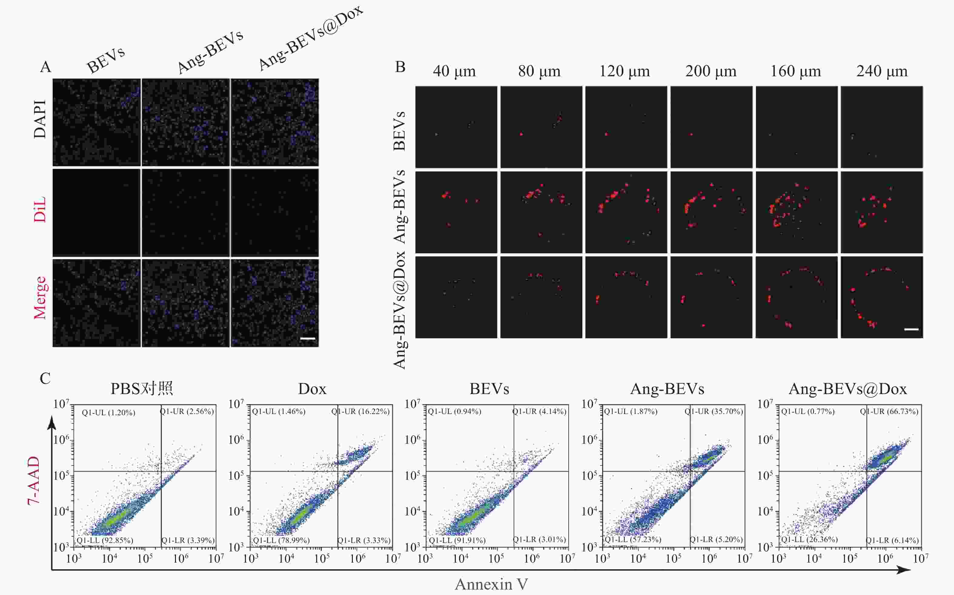 A. U87MG细胞摄取BEVs的CLSM图(标尺=100 μm);B. 三维肿瘤球渗透实验(标尺=100 μm);C. 流式检测Ang-BEVs@Dox细胞毒性注:Annexin-Ⅴ(膜联蛋白-V),能与凋亡早期细胞的胞膜结合;7-AAD是一种核酸染料,可穿透晚期凋亡细胞或者坏死细胞并与其内的DNA结合;晚期凋亡细胞和坏死细胞可同时被Annexin V-FITC和7-AAD结合染色呈现双阳性。