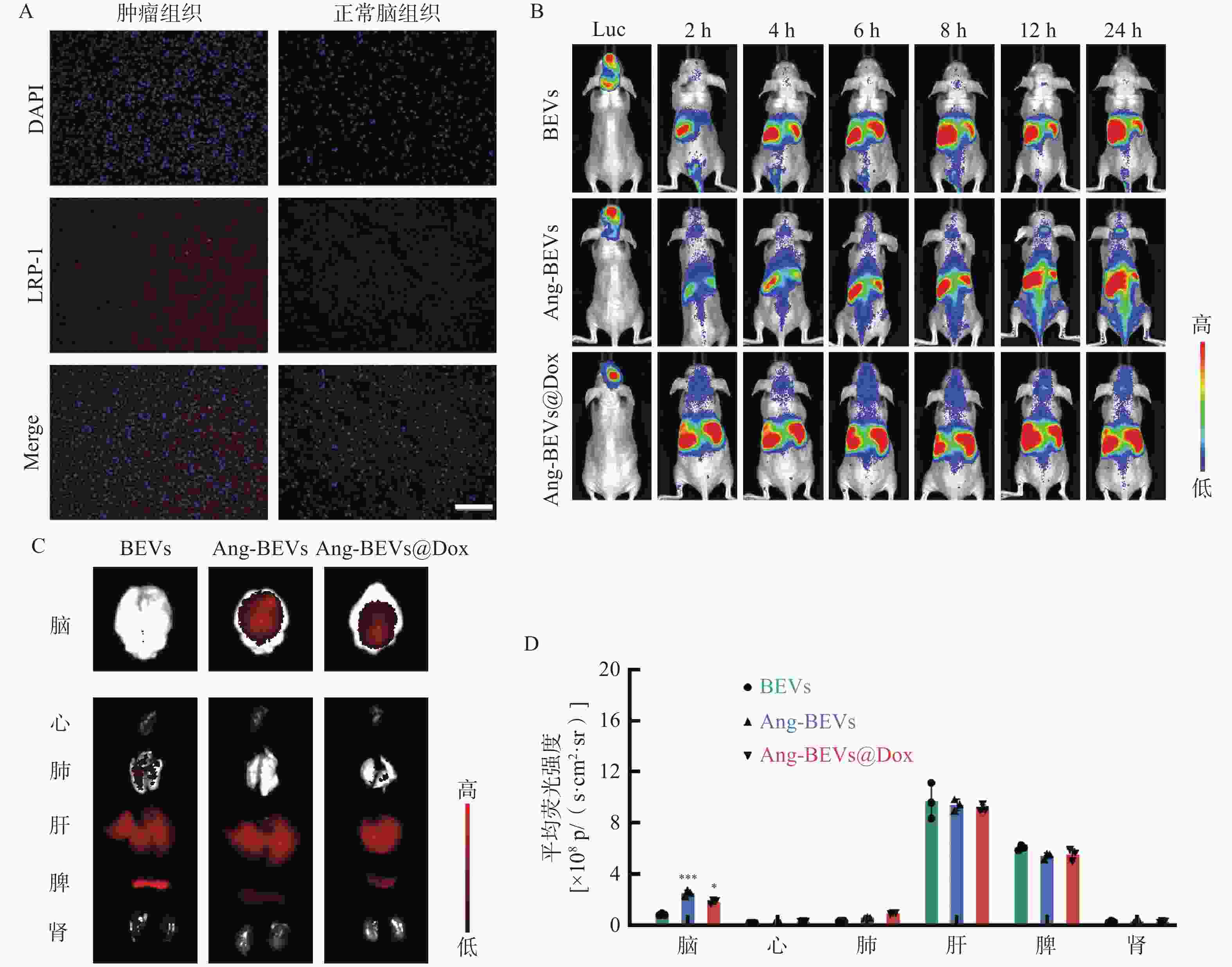 • 为进一步评估Ang-BEVs穿越BBB并靶向GBM组织的能力,利用U87MG-Luc细胞系构建了GBM原位异种移植模型(PDX模型)。造模1周后,经腹腔注射D-荧光素钾盐溶液,观察到小鼠脑部出现明显的荧光信号(图4B),表明PDX模型构建成功。随后,取一只造模成功小鼠的脑组织切片并进行LRP-1免疫荧光切片染色,结果显示肿瘤组织区域的荧光信号强度高于周围脑组织(图4A),与研究报道的结果一致[15]