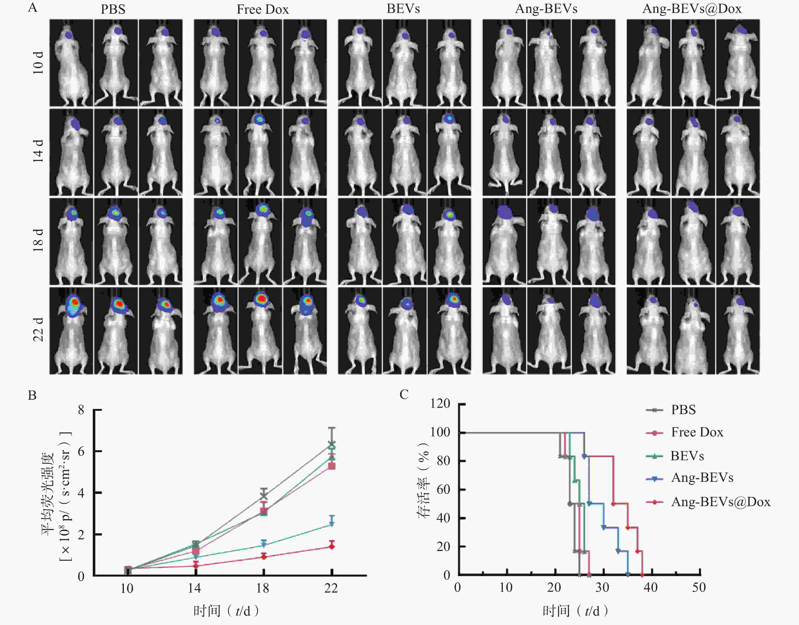 • 将造模成功的小鼠,随机分为5组(n=9,6只做生存分析和药效学评价,3只做组织切片),分别设置PBS对照组、Free Dox组、BEVs@Dox组以及Ang-BEVs组、Ang-BEVs@Dox组。从第10天开始,按照等效5 mg/kg的Dox剂量,采用尾静脉注射的方式进行给药,每3 d给药一次,共给药4次。在整个治疗过程中,定期使用小动物活体成像仪,检测荧光发光情况,以此反映肿瘤的生长或抑制情况。在第22天,给药终止,每组随机选择3只老鼠取脑和各重要器官进行组织病理学分析。最后记录各组小鼠存活时间,绘制生存分析曲线。