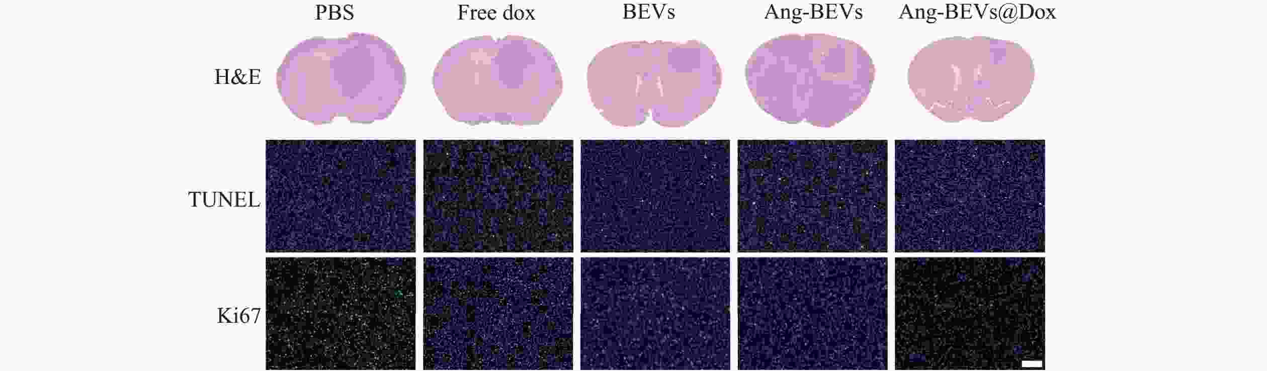 活体成像结果显示,Ang-BEVs@Dox组和Ang-BEVs组相较于PBS组、Free Dox组以及BEVs组,显著抑制了肿瘤增殖(图5A、5B)。这一结果表明,单纯的Dox以及未经修饰的BEVs难以有效穿透BBB。生存分析显示(图5C),Ang-BEVs@Dox组和Ang-BEVs组的中位生存期分别达到33.5 d和28.5 d,显著优于PBS组(23.5 d)、Free Dox组(24.0 d)及BEVs组(25.5 d)(图5CP<0.001)。这突显了经Angiopep-2修饰的BEVs负载Dox后,在靶向抑制肿瘤生长方面具有协同增强优势。