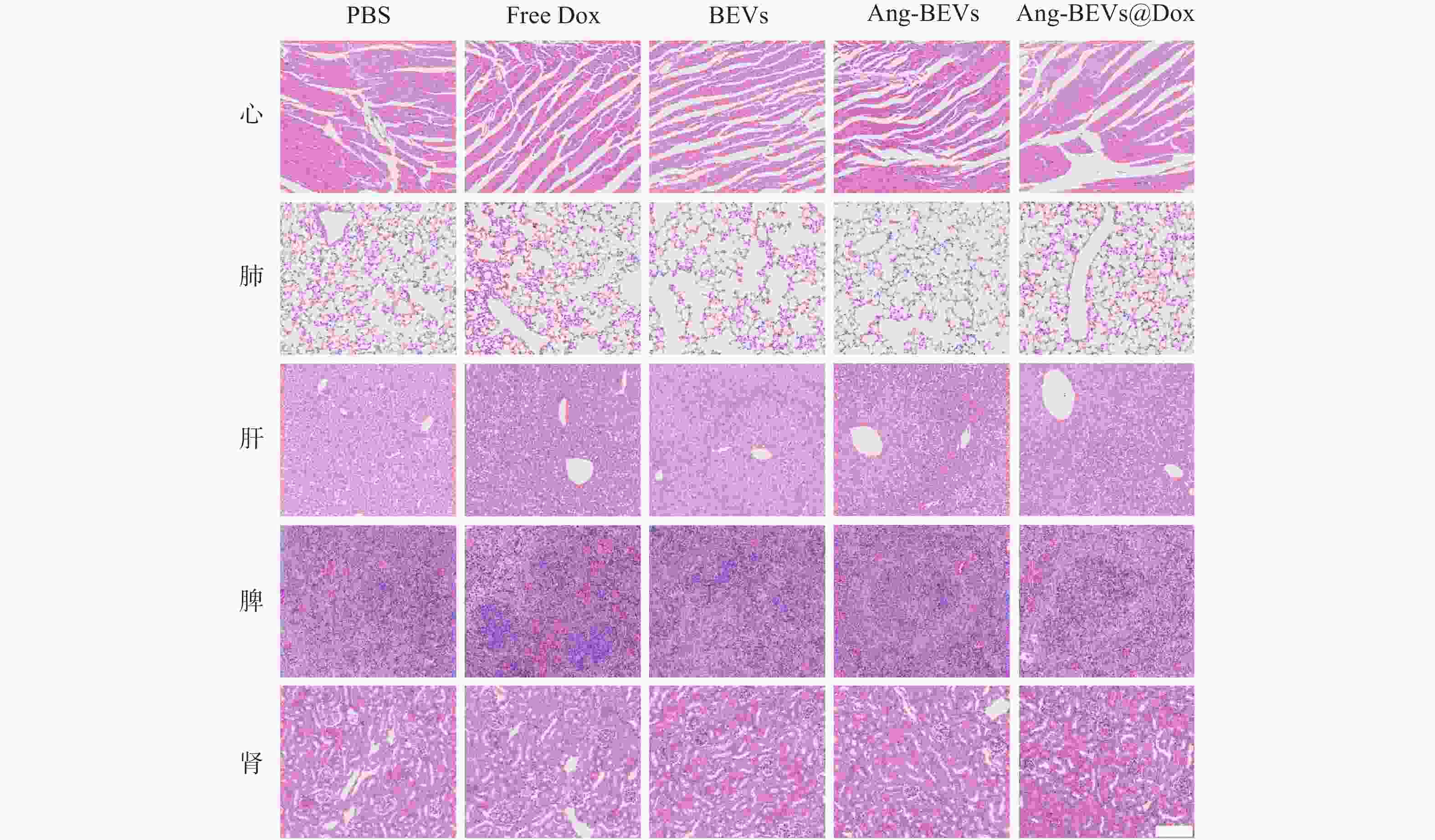 • 初步的药物安全性评估表明,Ang-BEVs@Dox递送系统治疗周期内具有较好的安全性。如图7所示,心脏、肝脏和肾脏等主要器官的没有明显的组织病理学损伤。空白Ang-BEVs组未观察到明显的毒性反应,表明载体本身具有良好的生物相容性。