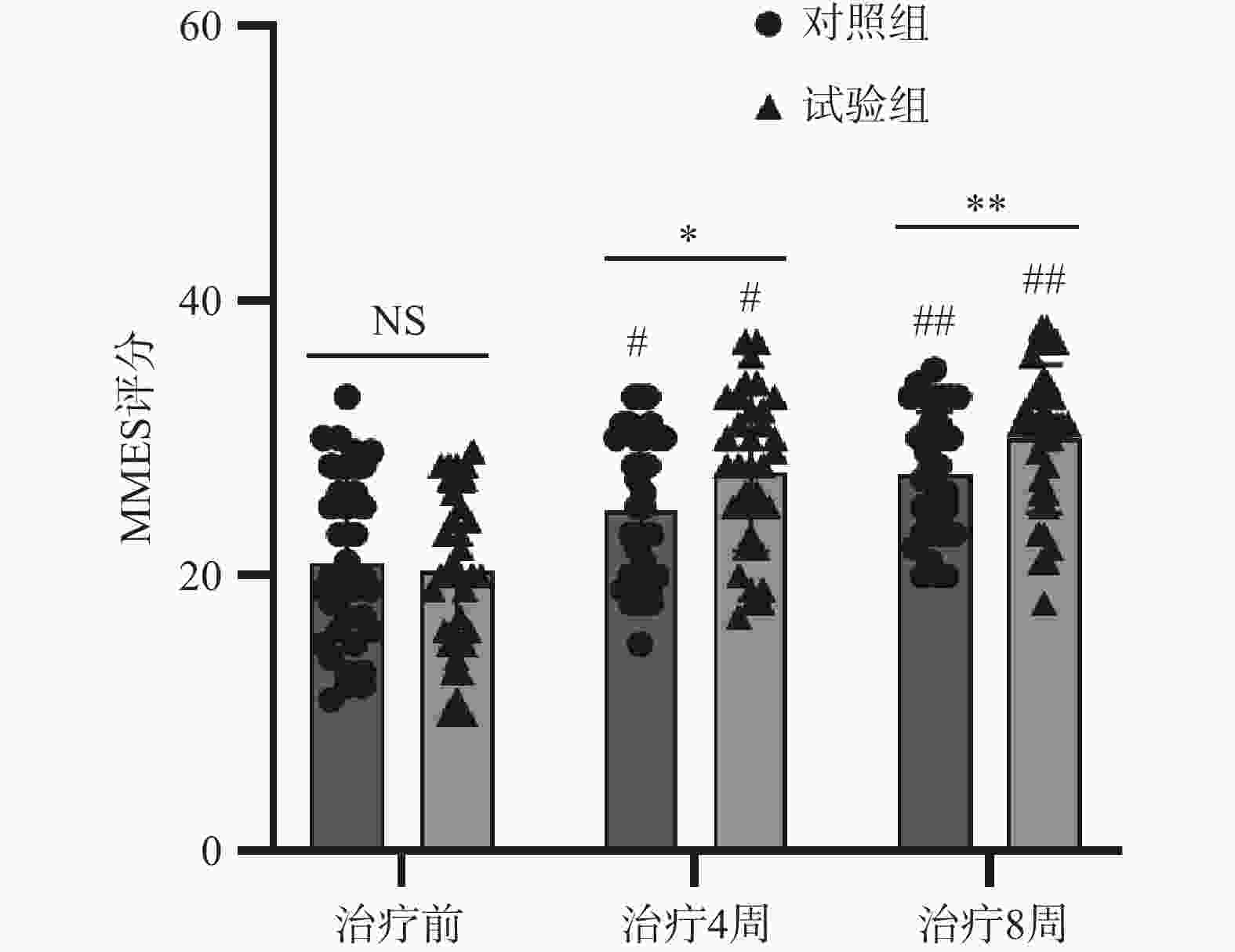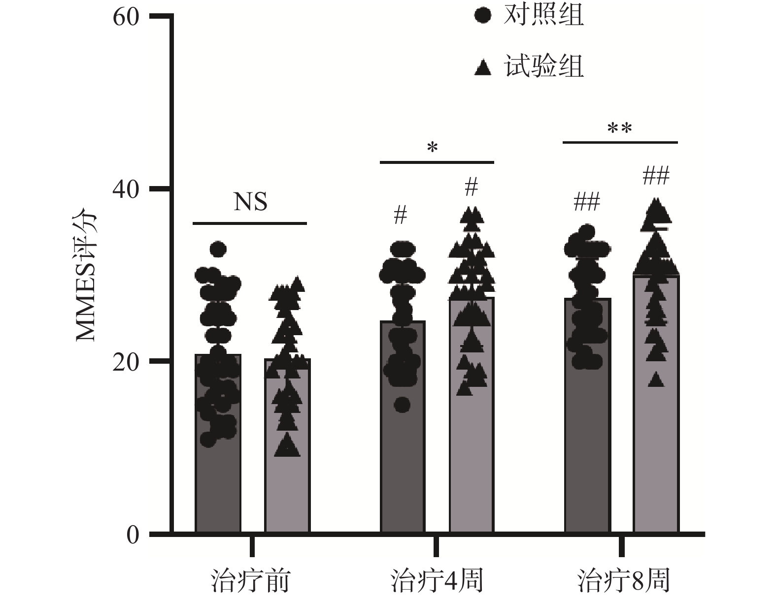 采用简易智力状态检查量表(Mini-Mental State Examination Scale, MMES)评估两组患者治疗前以及治疗后4周、8周的认知功能。该量表共19个条目,总分30分,<27分提示存在认知功能障碍。
