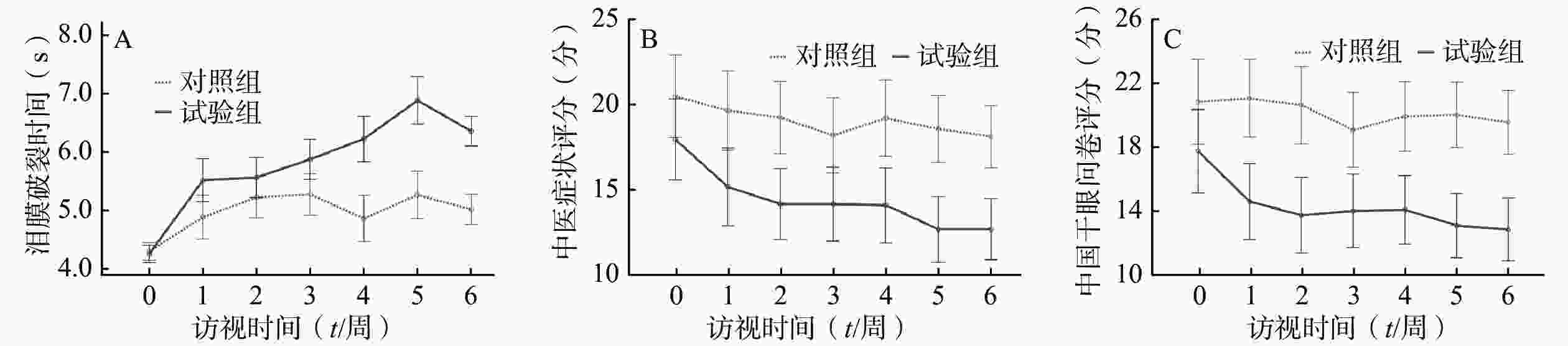 A.泪膜破裂时间;B.中医症状评分;C.中国干眼问卷评分