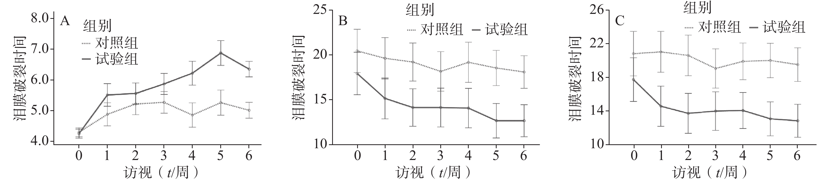 组别 BUT(n=60) TCM症状评分(n=30) 中国干眼问卷评分(n=30) 治疗前 治疗后 治疗前 治疗后 治疗前 治疗后 对照组 4.3±0.61 5.0±1.02** 20.4±5.5 18.1±4.7* 20.6±6.4 19.3±5.0 试验组 4.2±0.54 6.3±0.98**## 17.9±7.3 12.7±5.0**## 17.6±7.5 12.8±5.5**## t 0.403 -7.311 1.497 4.272 1.667 4.784 P 0.688 <0.001 0.140 <0.001 0.101 <0.001 *P <0.01,** P <0.001,与治疗前比较;## P <0.001,与对照组比较。 重复检测方差分析用来检查两组治疗后疗效指标随治疗周期的变化。治疗1~5周,BUT值呈现不断升高趋势,而TCM症状评分和中国干眼问卷评分不断降低,不同的治疗周期对疗效指标改善的影响是显著的(BUT值:P < 0.001;TCM症状评分:P<0.001; 中国干眼问卷评分:P =0.007),而仅在BUT值和TCM症状评分上,组别和周期表现出有显著性的交互作用,即相互影响(BUT值 P<0.001;TCM症状 P=0.044),见图4。