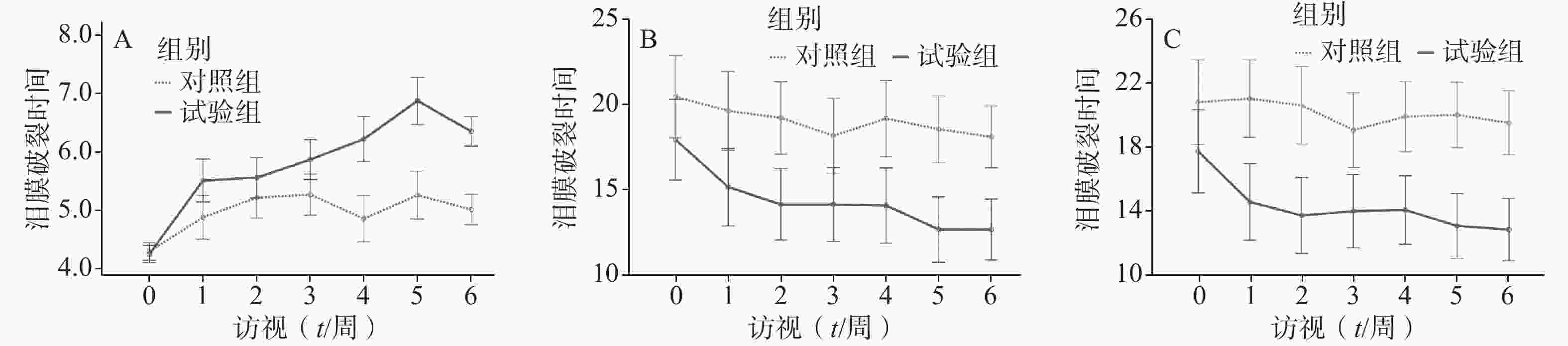 将两组治疗6周后的BUT、TCM症状评分、中国干眼问卷评分与治疗前比较,评估治疗有效性。参照《中药新药临床研究指导原则》,有效性评估标准如下:①显效:中医症状、体征明显改善;BUT增加≥70%;②有效:中医症状、体征均有改善;30%≤BUT增加<70%;③无效:中医症状、体征无改善或加重,BUT增加<30%。有效率=(显效+有效)/总例数×100%。