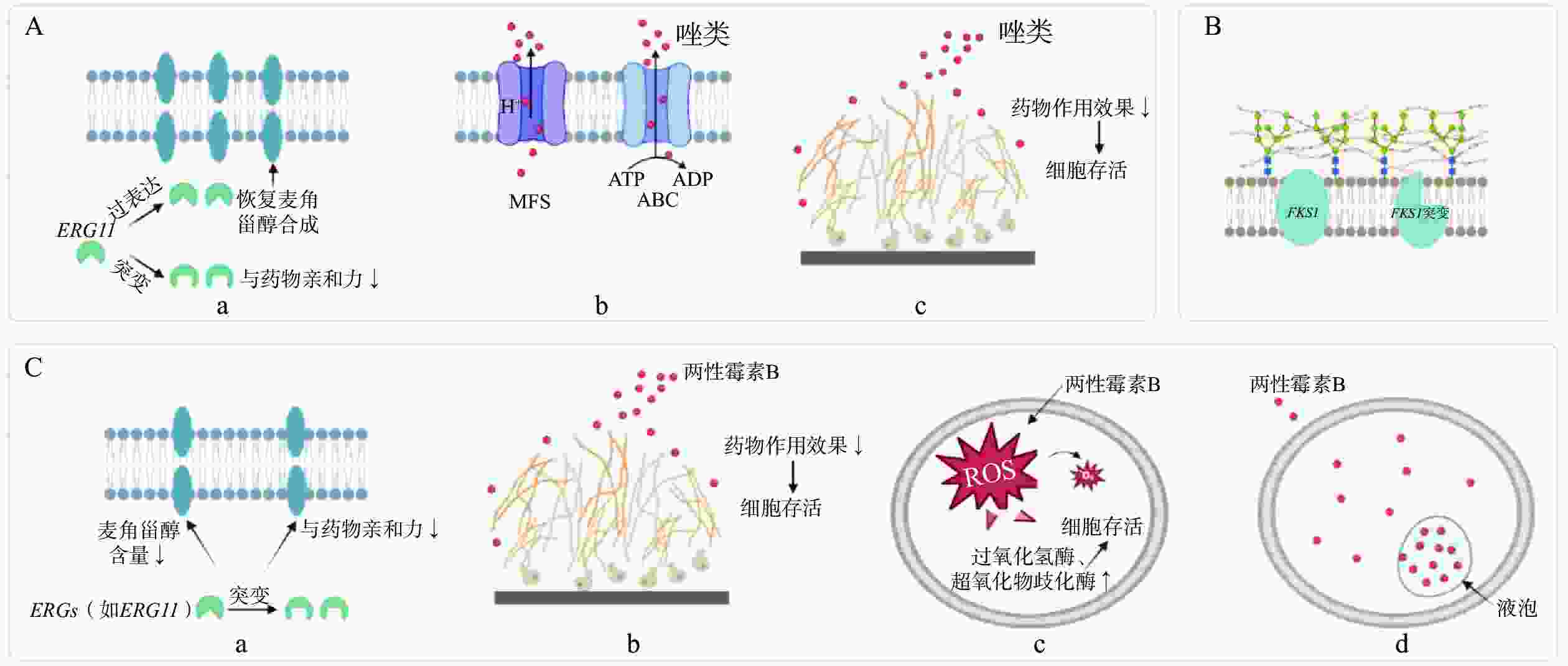 [1] AKINOSOGLOU K, PAPAGEORGIOU D, GOGOS C, et al. An update on newer antifungals[J]. Expert Rev Anti Infect Ther, 2025, 23(2-4): 149-158. doi: 10.1080/14787210.2025.2461566 [2] SZYMAŃSKI M, CHMIELEWSKA S, CZYŻEWSKA U, et al. Echinocandins–structure, mechanism of action and use in antifungal therapy[J]. J Enzyme Inhib Med Chem, 2022, 37(1): 876-894. doi: 10.1080/14756366.2022.2050224 [3] BERMAN J, KRYSAN D J. Drug resistance and tolerance in fungi[J]. Nat Rev Microbiol, 2020, 18(6): 319-331. doi: 10.1038/s41579-019-0322-2 [4] NOURRISSON C, MONIOT M, LAVERGNE R A, et al. Acquired fluconazole resistance and genetic clustering in Diutina (Candida) catenulata from clinical samples[J]. Clin Microbiol Infect, 2023, 29(2): 257. e7-257. e11. [5] BÉDARD C, GAGNON-ARSENAULT I, BOISVERT J, et al. Most azole resistance mutations in the Candida albicans drug target confer cross-resistance without intrinsic fitness cost[J]. Nat Microbiol, 2024, 9(11): 3025-3040. doi: 10.1038/s41564-024-01819-2 [6] FANDILOLU P, KUMAR C, PALIA D, et al. Investigating role of positively selected genes and mutation sites of ERG11 in drug resistance of Candida albicans[J]. Arch Microbiol, 2024, 206(11): 437. doi: 10.1007/s00203-024-04159-1 [7] ZARE-BIDAKI M, MALEKI A, GHANBARZADEH N, et al. Expression pattern of drug-resistance genes ERG11 and TAC1 in Candida albicans Clinical isolates[J]. Mol Biol Rep, 2022, 49(12): 11625-11633. doi: 10.1007/s11033-022-07878-0 [8] ROJAS A E, CÁRDENAS L Y, GARCÍA M C, et al. Expression of ERG11 ERG3 MDR1 and CDR1 genes in Candida tropicalis[J]. Biomedica, 2023, 43(Sp.1): 144-155. doi: 10.7705/biomedica.6852 [9] YENIŞEHIRLI G, ALıCı A, YENIŞEHIRLI A. Antifungal drug susceptibility profiles and molecular mechanisms of azole resistance in Candida blood stream isolates[J]. Indian J Med Microbiol, 2023, 45: 100389. doi: 10.1016/j.ijmmb.2023.100389 [10] VU B G, SIMONICOVA L, MOYE-ROWLEY W S. Calcineurin is required for Candida glabrata Pdr1 transcriptional activation[J]. mBio, 2023, 14(6): e02416-e02423. doi: 10.1101/2023.07.10.548434 [11] WASEEM M, DAS S, MONDAL D, et al. Identification of novel inhibitors against Med15a KIX domain of Candida glabrata[J]. Int J Biol Macromol, 2023, 253(Pt 2): 126720. [12] SUCHODOLSKI J, MURASZKO J, KORBA A, et al. Lipid composition and cell surface hydrophobicity of Candida albicans influence the efficacy of fluconazole-gentamicin treatment[J]. Yeast, 2020, 37(1): 117-129. doi: 10.1002/yea.3455 [13] MASSEY J, ZARNOWSKI R, ANDES D. Role of the extracellular matrix in Candida biofilm antifungal resistance[J]. FEMS Microbiol Rev, 2023, 47(6): fuad059. doi: 10.1093/femsre/fuad059 [14] ARASTEHFAR A, DANESHNIA F, HOVHANNISYAN H, et al. A multidimensional assessment of in-host fitness costs of drug resistance in the opportunistic fungal pathogen Candida glabrata[J]. FEMS Yeast Res, 2024, 24: foae035. doi: 10.1093/femsyr/foae035 [15] GÓMEZ-GAVIRIA M, GARCÍA-CARNERO L C, BARUCH-MARTÍNEZ D A, et al. The emerging pathogen Candida metapsilosis: biological aspects, virulence factors, diagnosis, and treatment[J]. Infect Drug Resist, 2024, 17: 171-185. doi: 10.2147/IDR.S448213 [16] BOUTIN C A, LUONG M L. Update on therapeutic approaches for invasive fungal infections in adults[J]. Ther Adv Infect Dis, 2024, 11: 20499361231224980. [17] RAMOS L S, BARBOSA P F, LORENTINO C M A, et al. The multidrug-resistant Candida auris, Candida haemulonii complex and phylogenetic related species: Insights into antifungal resistance mechanisms[J]. Curr Res Microb Sci, 2025, 8: 100354. [18] CAROLUS H, PIERSON S, LAGROU K, et al. Amphotericin B and other polyenes: discovery, clinical use, mode of action and drug resistance[J]. J Fungi, 2020, 6(4): E321. doi: 10.3390/jof6040321 [19] SHBETA M, KOPP T, VORONOV I, et al. Fluorescent probes derived from the polyene class of antifungal drugs reveal distinct localization patterns and resistance-associated vacuolar sequestration in Candida Species[J]. Angew Chem Int Ed, 2026, 65(2): e21135. doi: 10.1002/anie.202521135 [20] KE W X, XIE Y Y, CHEN Y Y, et al. Fungicide-tolerant persister formation during cryptococcal pulmonary infection[J]. Cell Host Microbe, 2024, 32(2): 276-289. e7. [21] BRAUNER A, FRIDMAN O, GEFEN O, et al. Distinguishing between resistance, tolerance and persistence to antibiotic treatment[J]. Nat Rev Microbiol, 2016, 14(5): 320-330. doi: 10.1038/nrmicro.2016.34 [22] DUMEAUX V, MASSAHI S, BETTAUER V, et al. Candida albicans exhibits heterogeneous and adaptive cytoprotective responses to antifungal compounds[J]. eLife, 2023, 12: e81406. doi: 10.7554/eLife.81406 [23] ZHENG L J, XU Y, WANG C, et al. Ketoconazole induces reversible antifungal drug tolerance mediated by trisomy of chromosome R in Candida albicans[J]. Front Microbiol, 2024, 15: 1450557. doi: 10.3389/fmicb.2024.1450557 [24] SAH S K, YADAV A, STAHL T, et al. Echinocandin adaptation in Candida albicans is accompanied by altered chromatin accessibility at gene promoters and by cell wall remodeling[J]. J Fungi, 2025, 11(2): 110. doi: 10.3390/jof11020110 [25] FENG Y R, LU H, WHITEWAY M, et al. Understanding fluconazole tolerance in Candida albicans: implications for effective treatment of candidiasis and combating invasive fungal infections[J]. J Glob Antimicrob Resist, 2023, 35: 314-321. doi: 10.1016/j.jgar.2023.10.019 [26] SUN L L, LI H, YAN T H, et al. Aneuploidy mediates rapid adaptation to a subinhibitory amount of fluconazole in Candida albicans[J]. Microbiol Spectr, 2023, 11(2): e03016-e03022. doi: 10.1128/spectrum.03016-22 [27] YANG F, SCOPEL E F C, LI H, et al. Antifungal tolerance and resistance emerge at distinct drug concentrations and rely upon different aneuploid chromosomes[J]. mBio, 2023, 14(2): e00227-e00223. doi: 10.1101/2022.11.30.518455 [28] ZARNOWSKI R, HORTON M V, JOHNSON C J, et al. Dual function of Candida auris mannosyltransferase, MNT5, in biofilm community protection from antifungal therapy and the host[J]. mBio, 2025, 16(4): e00346-e00325.