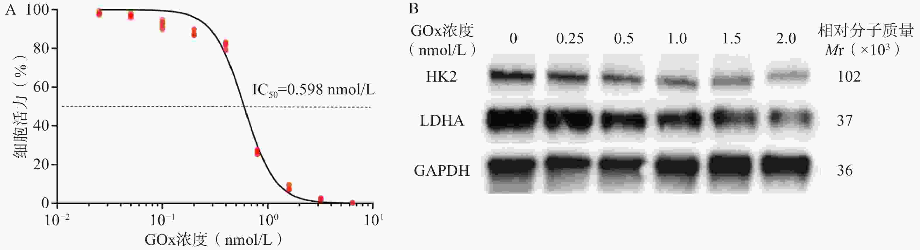 $$ \text{细胞活力} = \frac{{{A}}_{\text{实验组}}-{{A}}_{\text{空白对照组}}}{{{A}}_{\text{阴性对照组}}-{{A}}_{\text{空白对照组}}} \times 100{\text{%}} $$ GL261细胞接种至12孔板。设置不同浓度GOx实验组与不加GOx对照组(n=3)。孵育24 h后提取细胞蛋白,Western Blot检测细胞中己糖激酶2(HK2)和L-乳酸脱氢酶(LDHA)的水平,以GAPDH为内参,因LDHA与GAPDH Western Blot条带位置相近,需在去除GAPDH抗体后再显示LDHA条带。