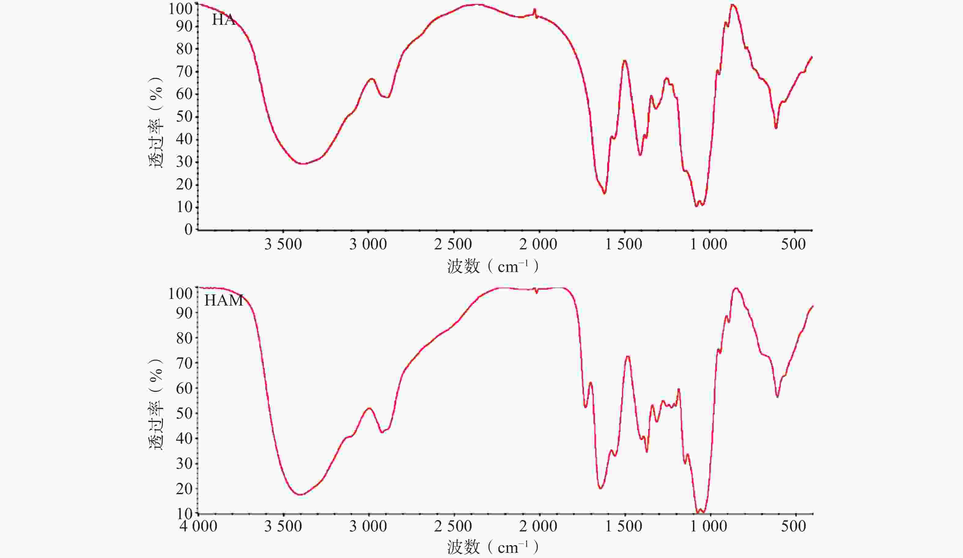 HA与HAM的红外透射光谱如图2所示,HAM的红外光谱相较HA在