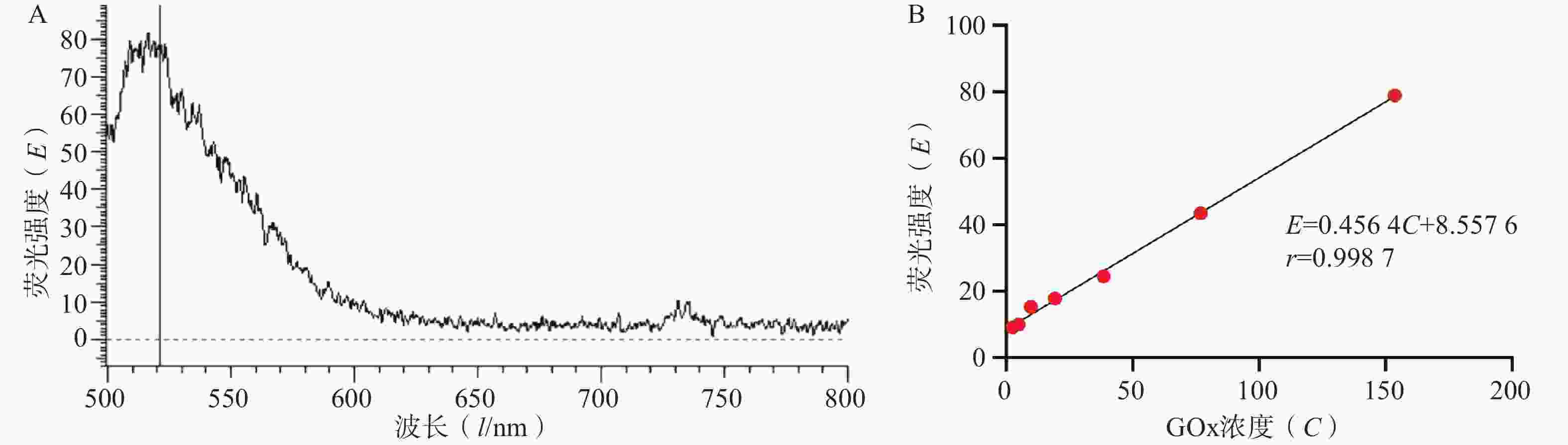 GOx溶解于PBS(pH8.5, 0.01 mol/L),FITC标记制备FITC-GOx,精确量取FITC-GOx,配制不同浓度的FITC-GOx标准溶液,荧光分光光度计测定荧光强度(Ex/Em, 488/520 nm),以荧光强度E与对照品浓度 C 作图,线性回归得标准曲线。