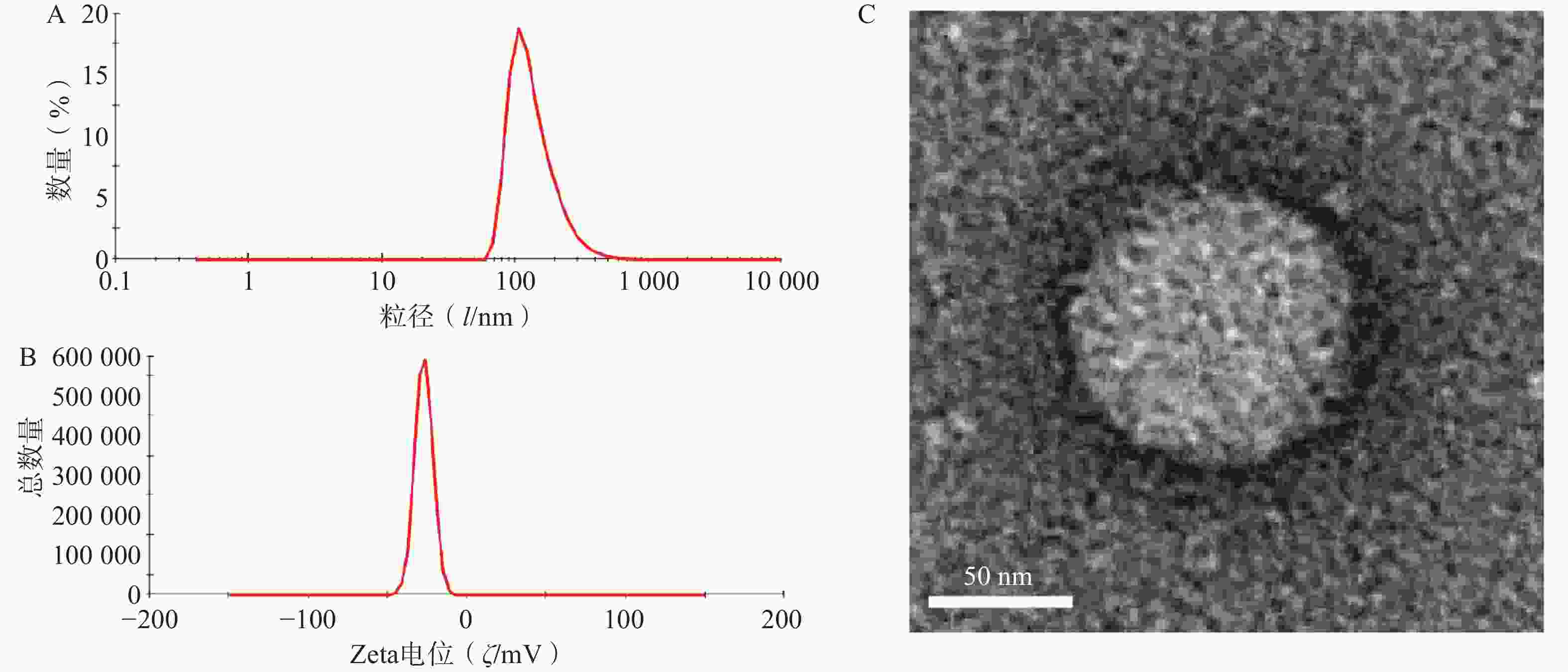 选择GOx和HAM药载质量比1∶10制备GONGs,马尔文激光粒度仪测定粒径、Zeta电位。取GONGs经醋酸铀负染,透射电镜观察粒径与外观形态。