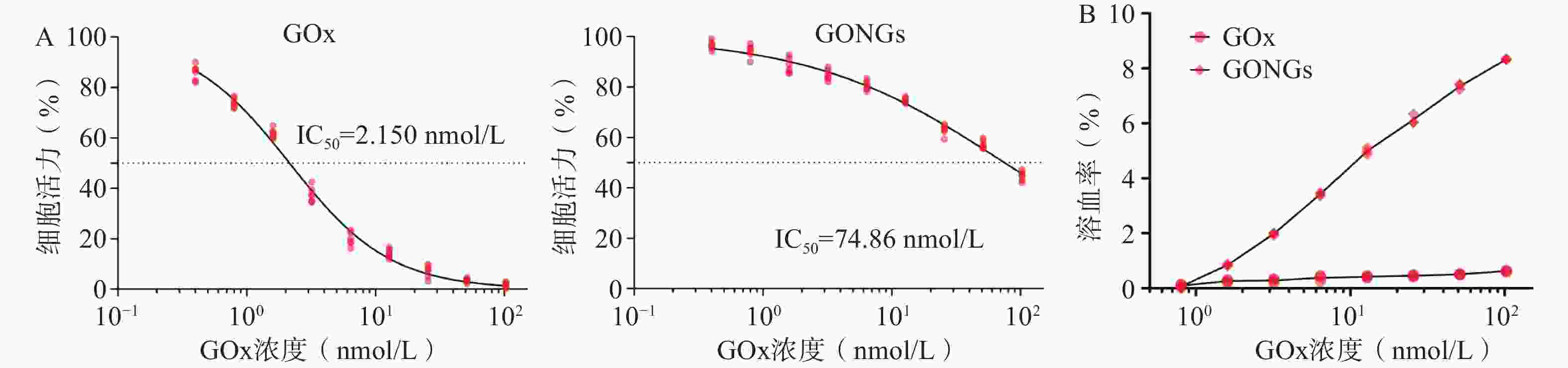新西兰兔(雄性,2.5 kg)静脉取血,离心分离法制备体积分数 (φ)=2.5%的红细胞悬液。设置不同浓度GONGs(GOx 0.8~102.4 nmol/L)实验组,并配制同等浓度GOx对照组,生理盐水和TritonX-100分别作为阴性和阳性对照。各组样品与红细胞37 ℃孵育3 h,