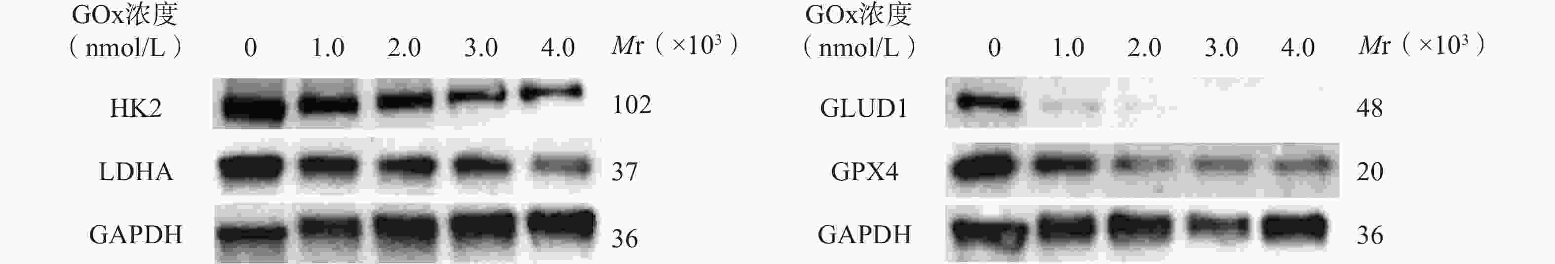 GL261接种至12孔板培养。设置不同浓度GONGs(GOx 1.0~4.0 nmol/L)实验组,不加GONGs的细胞作为对照组(n=3)。孵育24 h后提取蛋白,Western Blot检测HK2、LDHA、谷氨酸脱氢酶 1(GLUD1)和谷胱甘肽过氧化酶4(GPX4)蛋白的表达。
