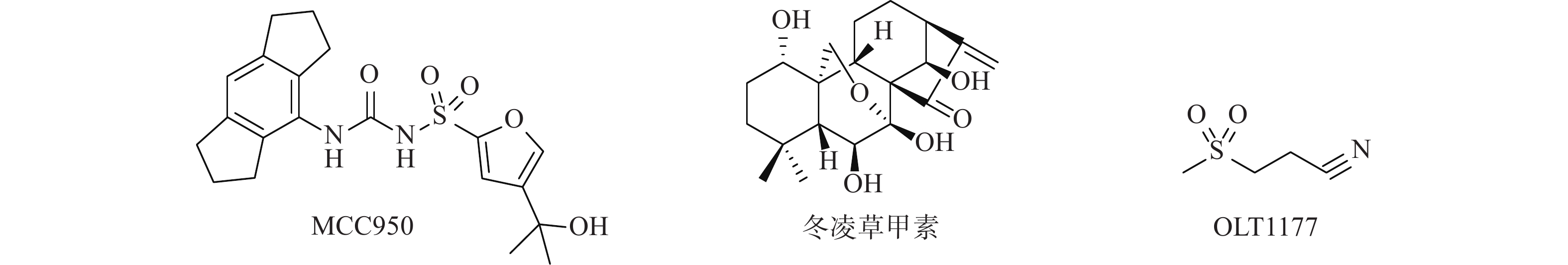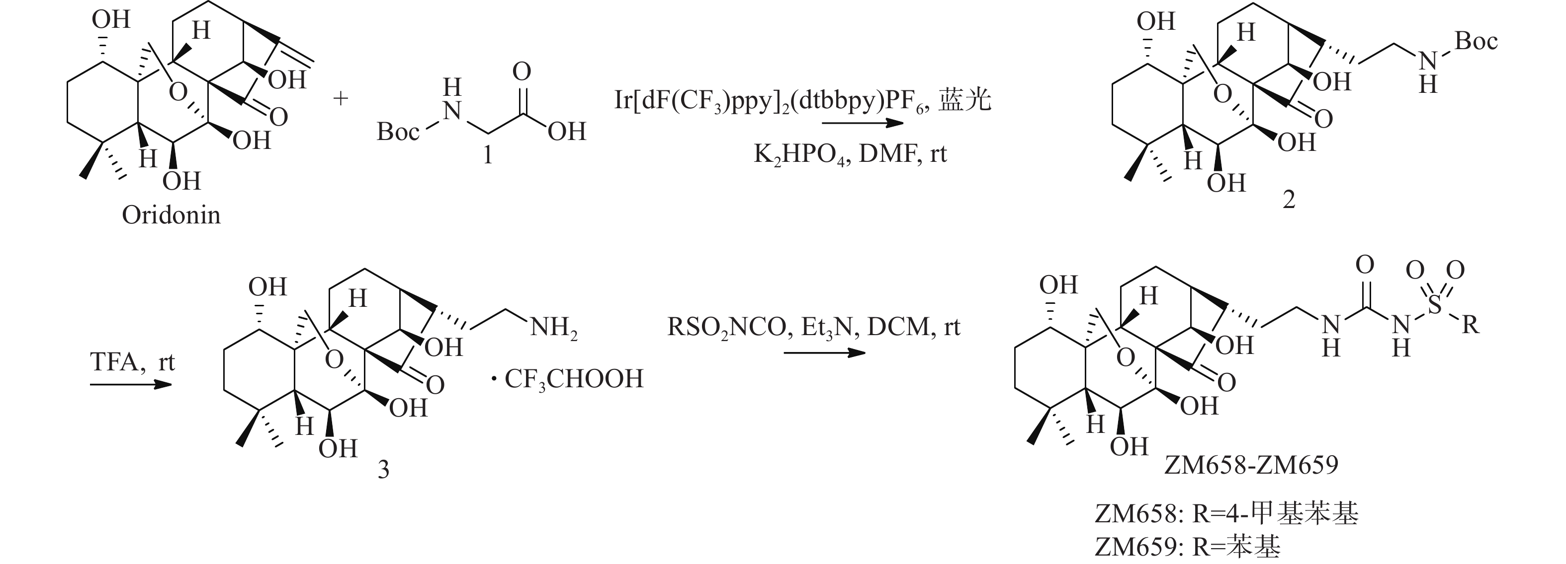 Objective To study anti-inflammatory activities of oridonin derivatives without Michael fragment. Methods Two oridonin sulfonylureas were designed and synthesized by a photocatalysis reaction and a scaffold hopping strategy. The inhibitory rate of IL-1β was selected for anti-inflammatory activity evaluation. Results Both compound ZM658 and ZM659 revealed potent anti-inflammatory activities with the values of 69.3% and 59.7% in THP-1 cells, respectively. Moreover, two compounds also showed dose-dependent and low cytotoxicity. Conclusion The result indicated that Michael receptor fragment of oridonin could be substituted with sulfonylurea group.