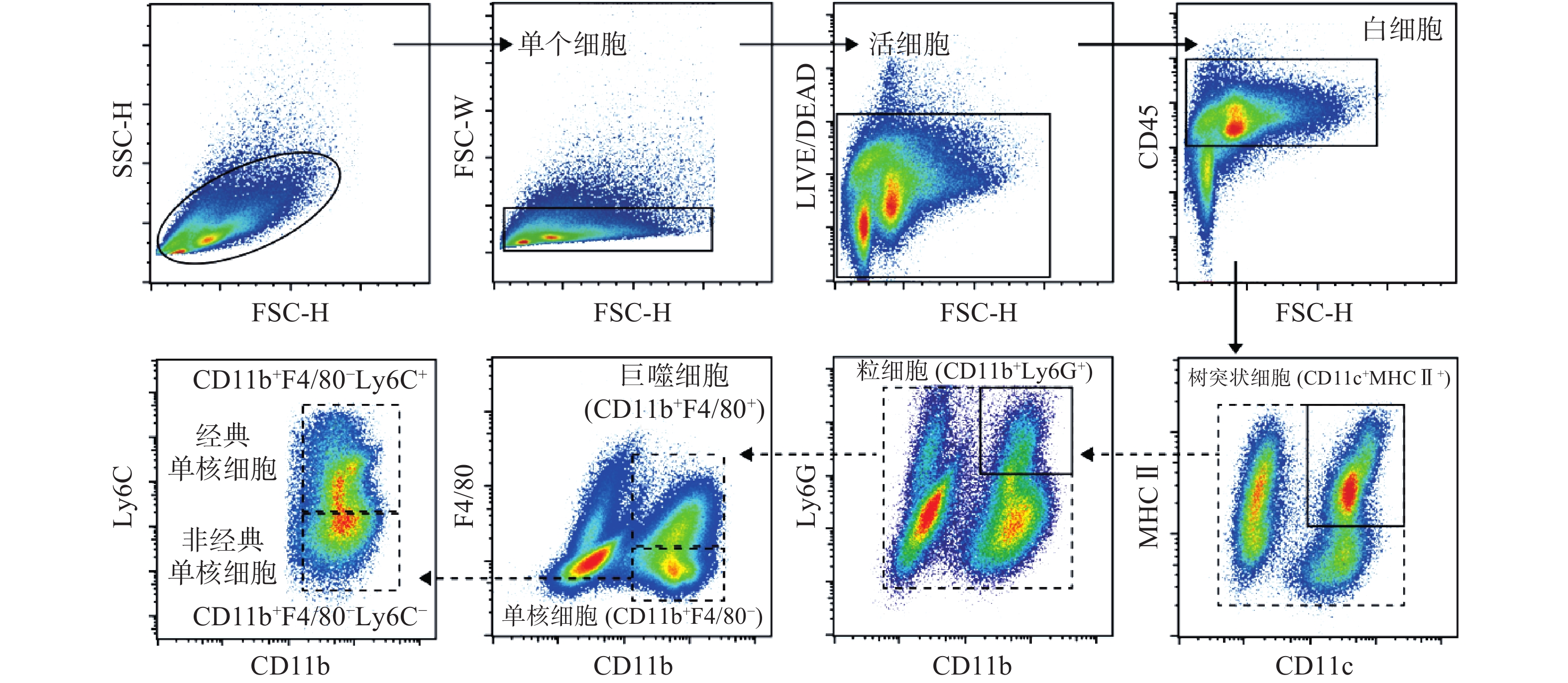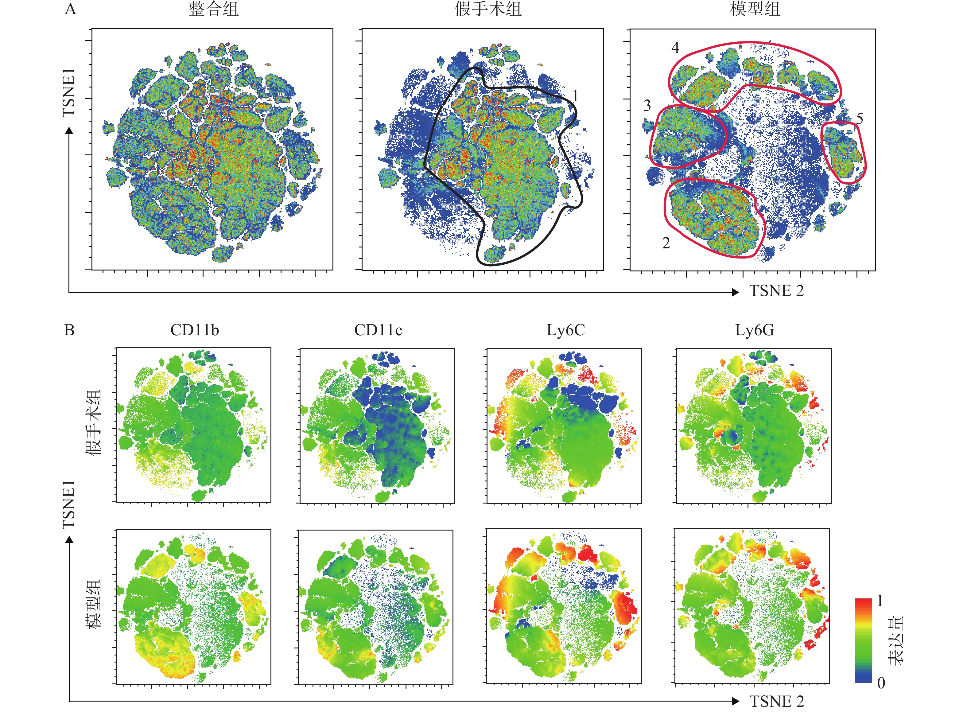 Objective To explore the analytical methods combining multicolor flow cytometry with bioinformatics techniques for analyzing myeloid cells in the gastrocnemius of mice after muscle injury, and provide an experimental foundation for the study of muscle regeneration mechanisms. Methods Immune cells were collected from single-cell suspensions of mouse gastrocnemius using multicolor flow cytometry, and data were analyzed by the t-distributed stochastic neighbor embedding(t-SNE)algorithm supplemented by manual gating techniques. The tSNE algorithm was used in multicolor flow cytometry to guide the setting of manual gates, optimize the identification and classification of cell populations. Results Compared to the sham surgery group, the proportions of dendritic cells, granulocytes, macrophages, and monocytes at the site of muscle injury in the model group significantly increased, with the increasing in monocytes being particularly notable. Conclusion The application of the tSNE algorithm combined with manual gating techniques in multicolor flow cytometry demonstrated that this method could effectively guide the setting of manual gates and enhance the efficiency of distinguishing immune cell types. Through this combined technology, the function and subtypes of myeloid cells in the mouse gastrocnemius could be analyzed more accurately.