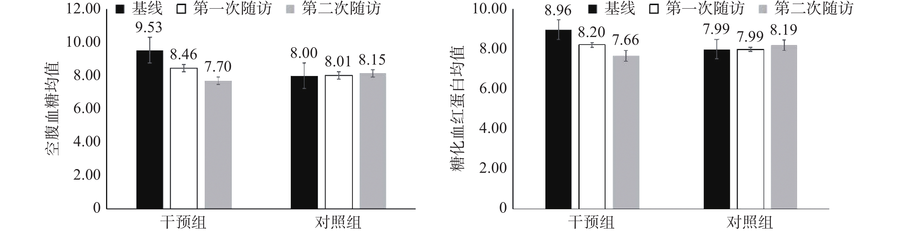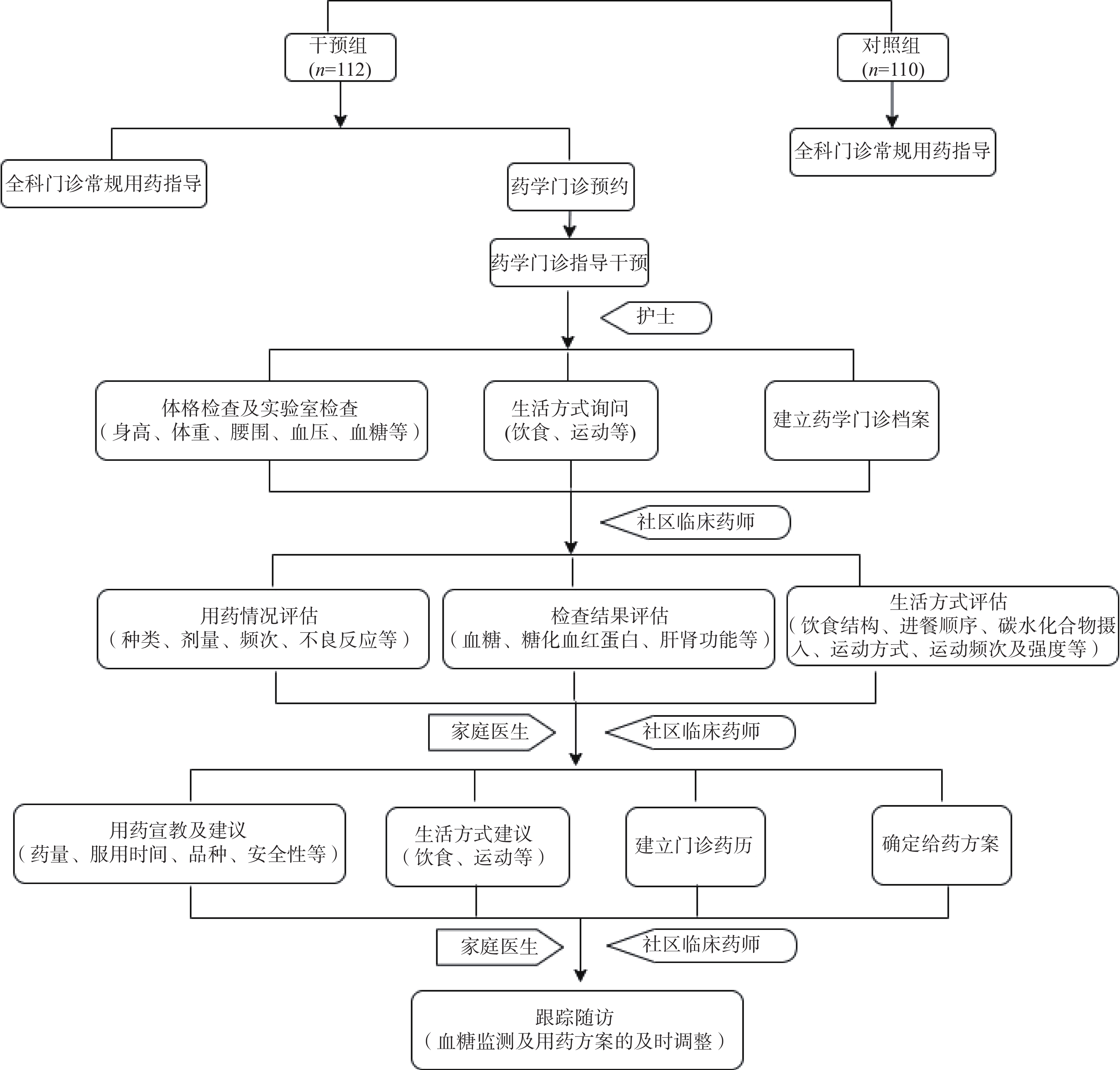 Objective To explore the effect of community pharmacy outpatient service on patients with type 2 diabetes mellitus. Methods A non-randomized controlled study was conducted, and type 2 diabetes patients managed in the community were divided into an intervention group of 112 cases and a control group of 110 cases. The control group received routine medication guidance during general practice outpatient visits, while the intervention group received comprehensive pharmacy outpatient service intervention based on routine medication guidance in general practice. Follow-up visits were conducted every 3 months. Repeated measurement analysis of variance and multivariate linear regression analysis were used to evaluate the intervention effect of the pharmacy outpatient service. Results Fasting blood glucose and glycosylated hemoglobin levels in the intervention group showed a decreasing trend with the increase of intervention time compared to pre-intervention time (P<0.01), with increased duration of weekly exercise, decreased staple food intake, increased vegetable intake, and increased medication adherence score (P<0.01). After adjusting for confounding factors through multivariate linear regression model, pharmacy outpatient intervention was found to be an independent protective factor for fasting blood glucose level (β=−0.891, P<0.01) and glycosylated hemoglobin level (β=−0.760, P<0.01) in the study subjects. Conclusion The community pharmacy outpatient service could enhance the self-management ability of patients with type 2 diabetes mellitus, and effectively improve patients’ fasting blood glucose and glycosylated hemoglobin.