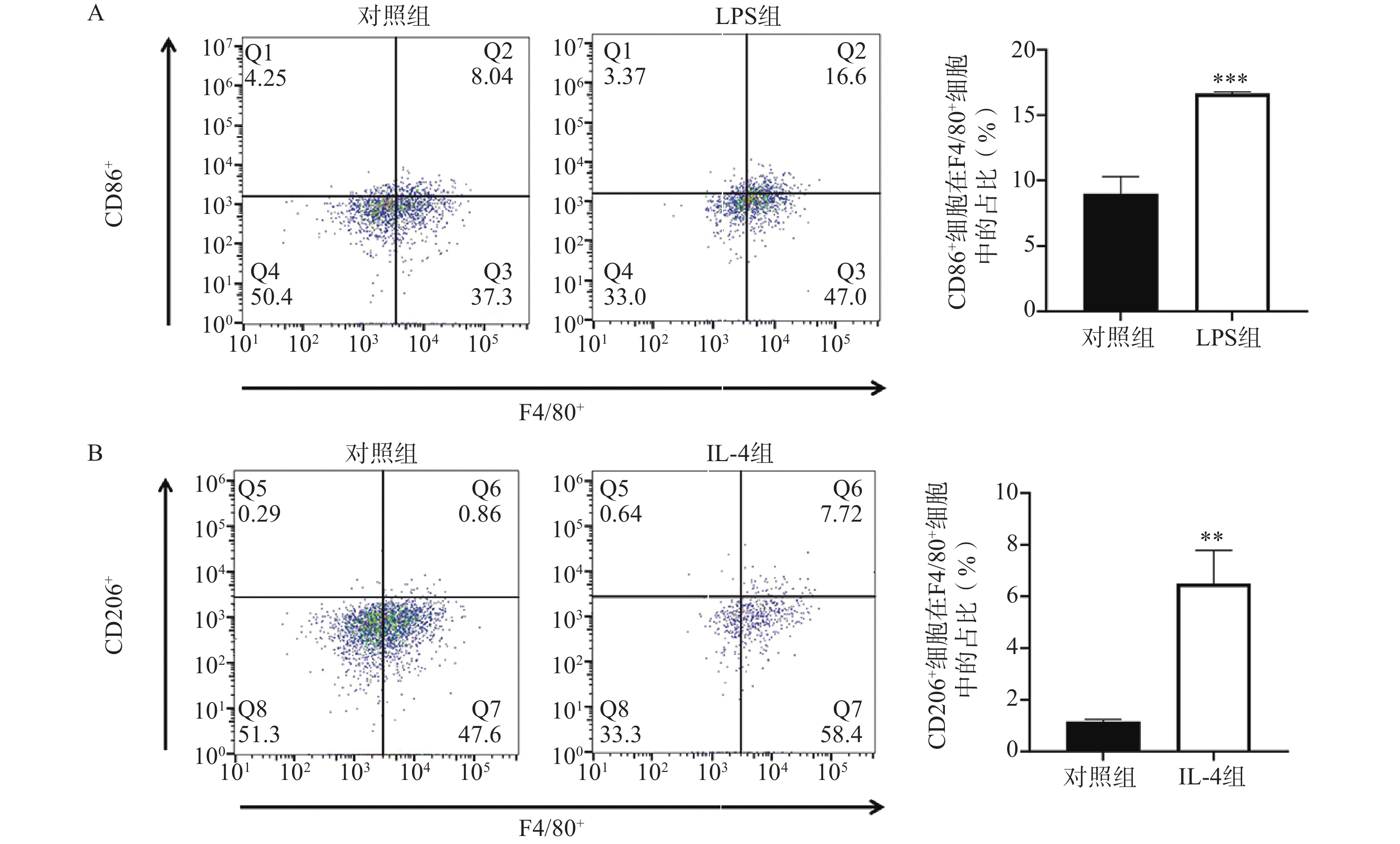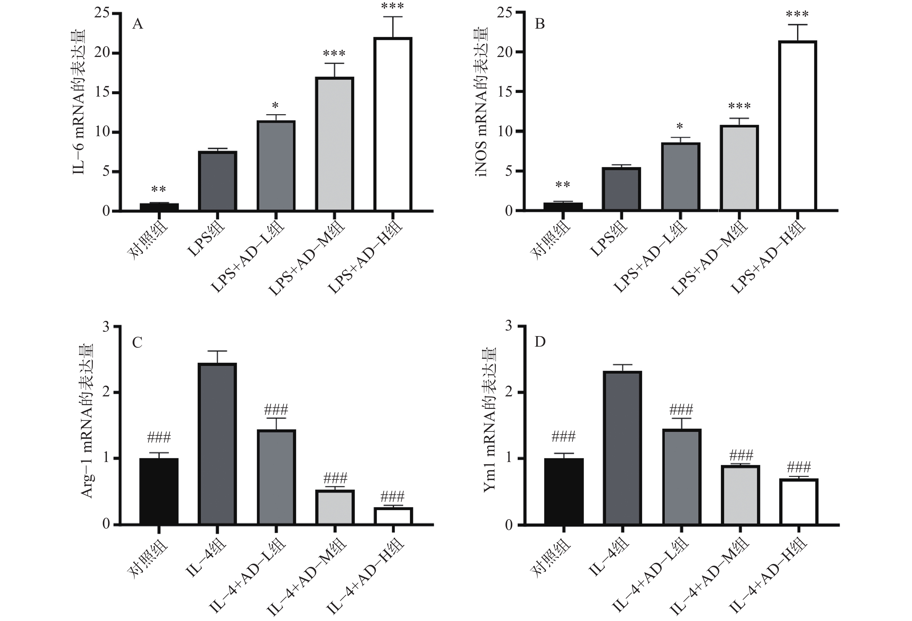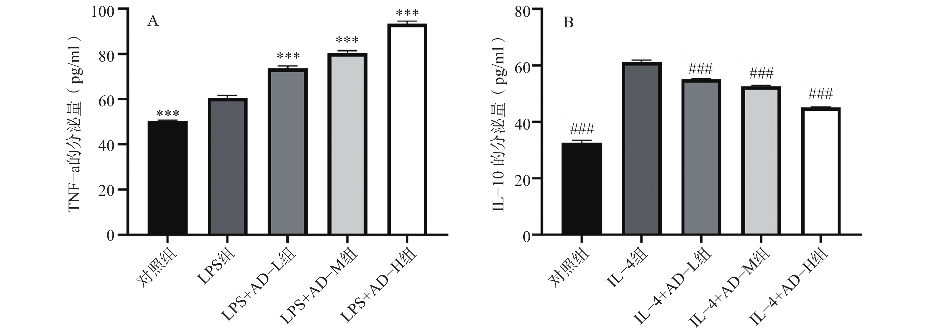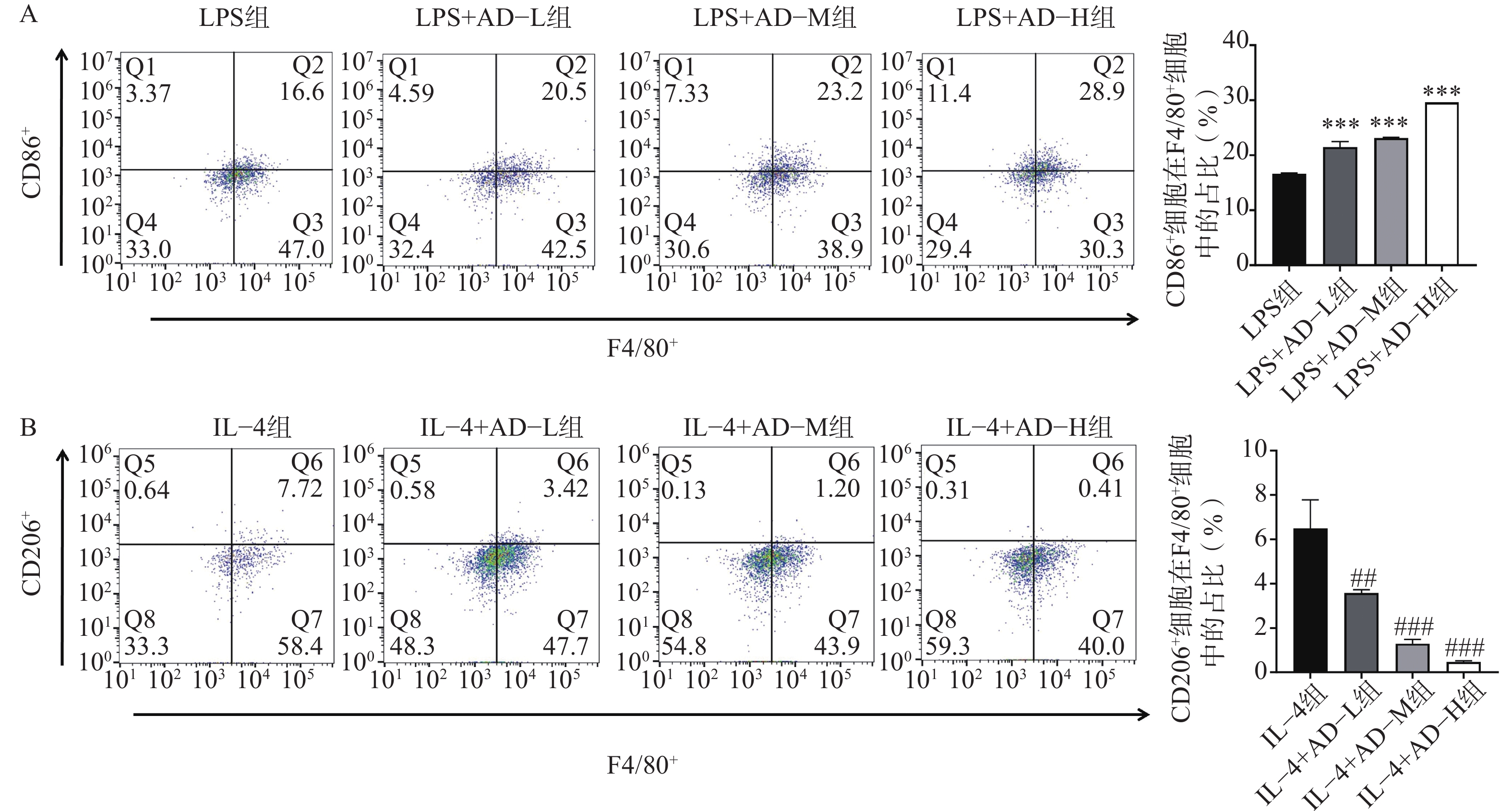 Objective To investigate the effects of Aconite decoction (AD) on the viability and polarization of murine RAW264.7 macrophages induced by lipopolysaccharide (LPS) or interleukin-4 (IL-4). Methods Cytotoxicity of AD was assessed by the CCK-8 assay. RAW264.7 cells were polarized toward M1 phenotype by LPS or M2 phenotype by IL-4, followed by treatment with varying concentrations of AD. Macrophage polarization was analyzed by flow cytometry. Quantitative PCR was performed to measure mRNA expression of polarization-associated markers (IL-6, iNOS, Arg1, and Ym1). ELISA was used to quantify secreted cytokines (TNF-α and IL-10)in the supernatant. Results At non-toxic concentrations, IL-6 and iNOS mRNA levels in LPS-stimulated cells were significantly upregulated while Arg1 and Ym1 expression in IL-4-treated groups were downregulated by AD. Concurrently, TNF-α secretion in LPS-induced M1 polarization was enhanced but IL-10 production in IL-4-induced M2 polarization was suppressed by AD. Conclusion AD could promote macrophage proliferation and viability, augments LPS-driven M1 polarization, and inhibit IL-4-mediated M2 polarization, which provided experimental evidence for the potential application of AD in tumor immunotherapy.
