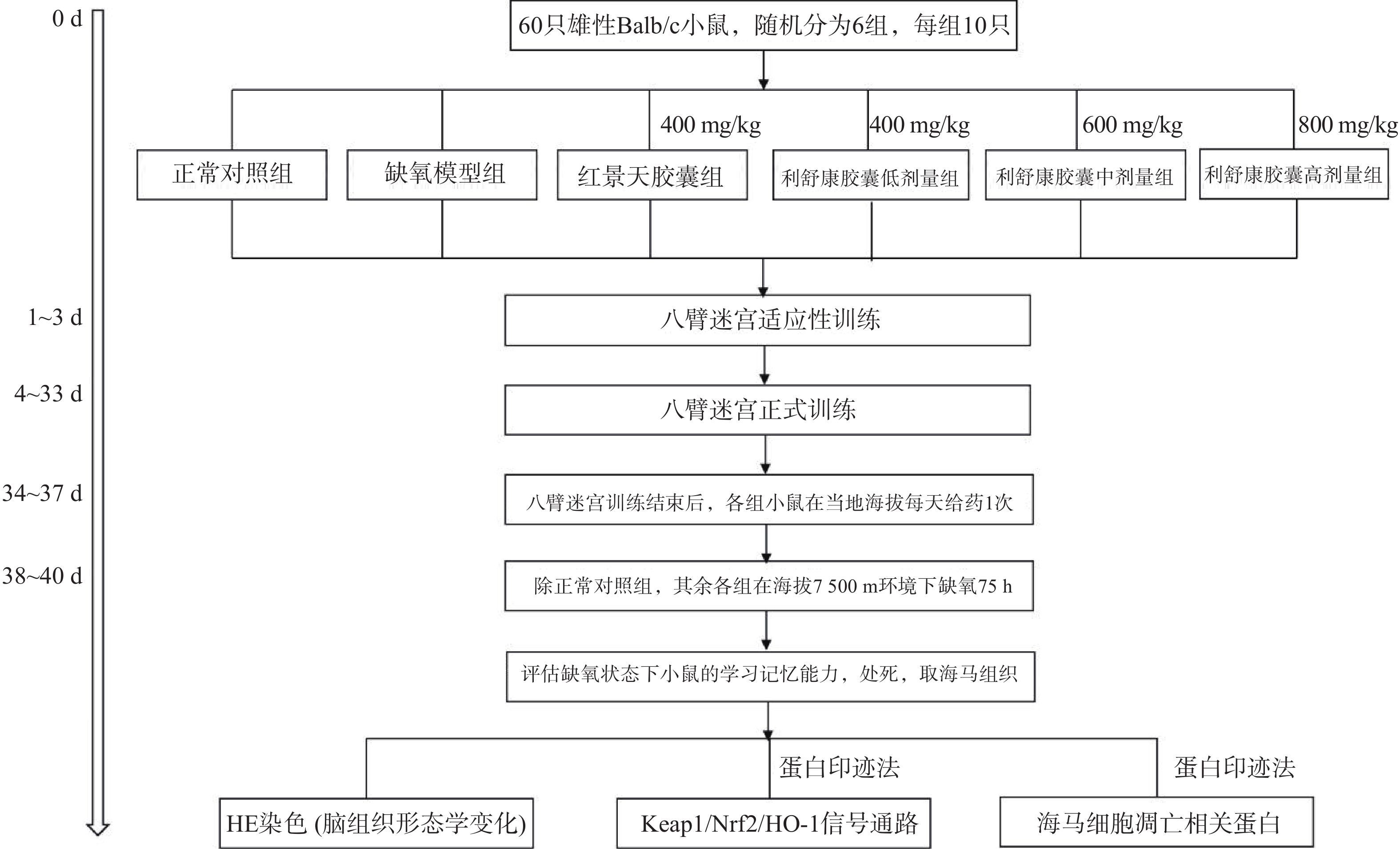 Objective To study the effect of Lishukang capsule on learning and memory impairment in mice with high altitude hypoxia based on Keap1/Nrf2/HO-1 signal pathway. Methods Sixty male Balb/C mice were randomly divided into normal control group, hypoxia model group, Rhodiola capsule group (400 mg/kg), low, medium and high dose groups of Lishukang capsule (400、 600、 800 mg/kg), with 10 mice in each group. The normal control group was fed at the local altitude (1 500 m) after 7 days of intragastric administration in each group, and the rest groups were fed at the low pressure and hypoxia animal experimental cabin to simulate the altitude of 7500 m for hypoxia for 3 days. During this period, the normal control group and the hypoxia model group were given normal saline once a day, and 1 hour after the last administration, the eight arm maze was used to test the spatial memory ability of mice under simulated high altitude hypoxia; HE staining was used to observe the morphological changes of hippocampus in mice; Western blot was used to detect the changes of protein content of Keap1/Nrf2/HO-1 signal pathway and apoptosis related protein in hippocampus of mice. Results Compared with the normal control group, the spatial memory ability of mice in the hypoxia model group was significantly impaired (P<0.01); HE staining showed that hippocampal neurons in mice were seriously injured; the content of brain tissue Keap1 protein and apoptosis related protein Bax and Caspase-3 increased (P<0.01); the content of Nrf2, HO-1 and apoptosis related protein Bcl-2 decreased (P<0.01). Compared with the hypoxia model group, the error rate of mice in the high dose group of Lishukang capsule in the eight arm maze behavior experiment was significantly reduced (P<0.05, P<0.01); HE staining showed that the neurons were arranged orderly and the cell morphology was good; the content of Keap1 protein and apoptosis related protein Bax and Caspase-3 decreased (P<0.01); the content of Nrf2, HO-1 and apoptosis related protein Bcl-2 increased(P<0.01). Conclusion High altitude hypoxia can lead to oxidative stress injury in mice and induce the expression of apoptosis related genes, thus aggravating the cognitive dysfunction of mice; Lishukang capsule can effectively improve the learning and memory impairment in mice caused by hypoxia, and its mechanism may be related to regulating the Keap1/Nrf2/HO-1 signal pathway and reducing apoptosis.