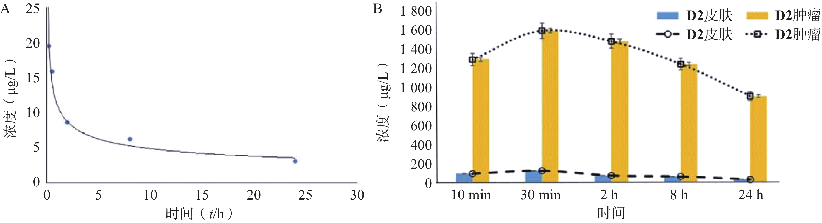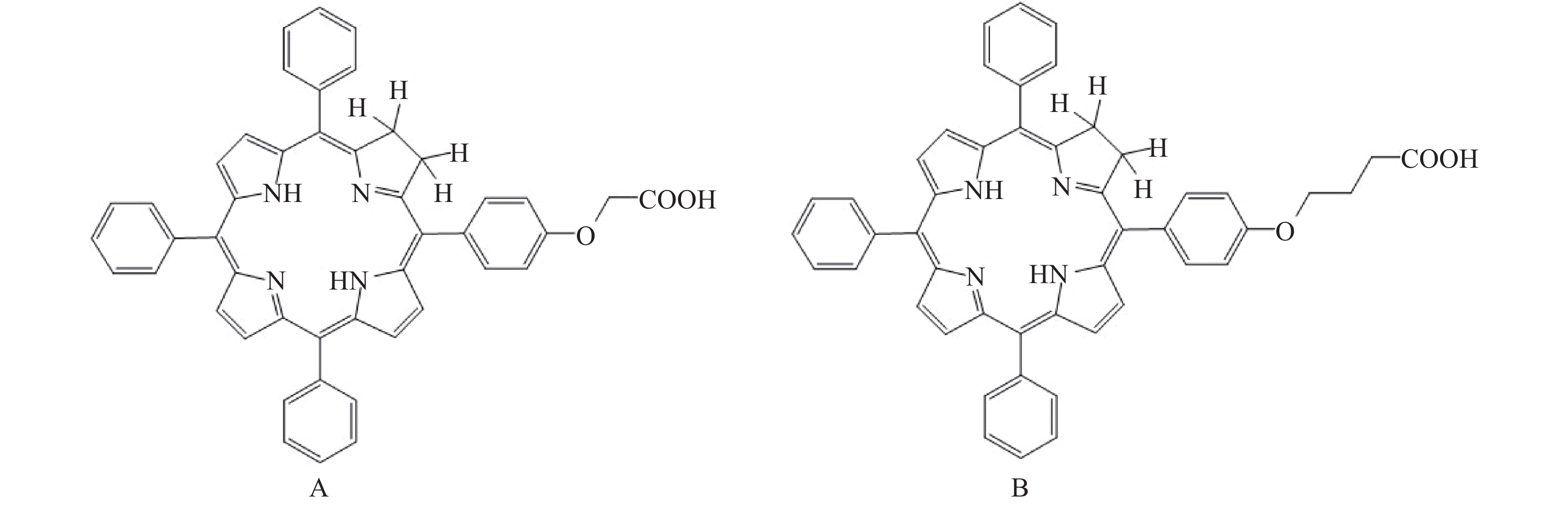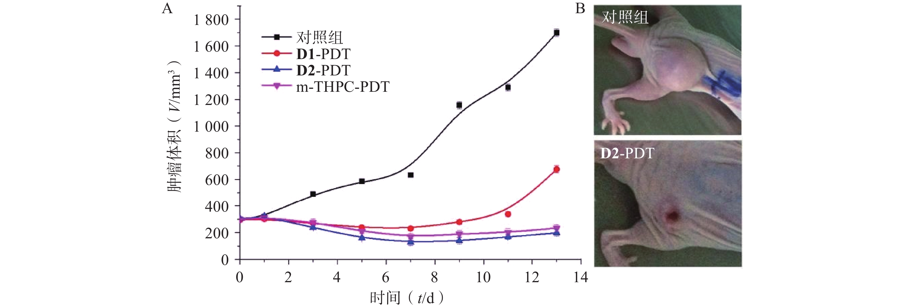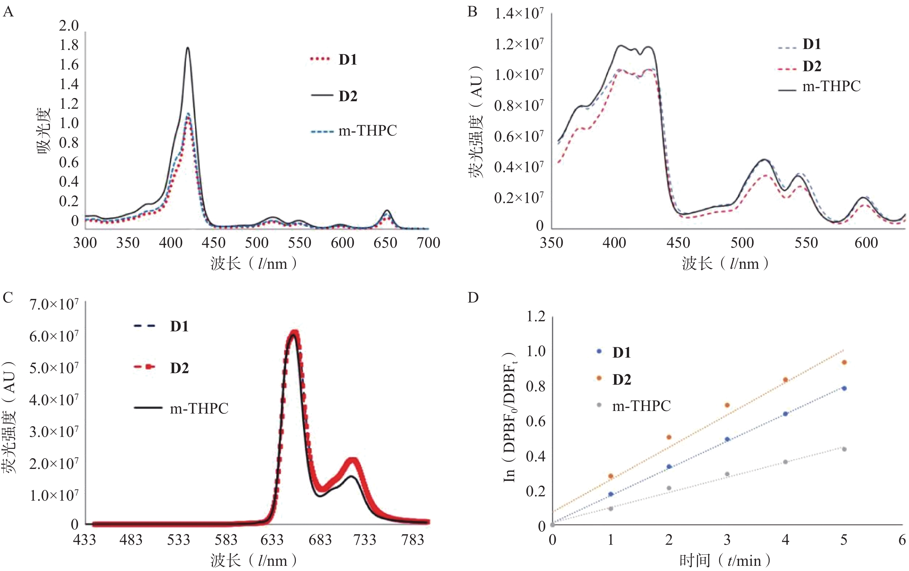 Objective To study the photodynamic performance and the killing effect of photodynamic therapy on lung cancer of novel chlorin compounds 2-(4-(5,15,20-triphenyl-7H,8H-porphyrin-10-yl) phenoxy) acetic acid( D1 )and 4-(4-(5,15,20-triphenyl-7H,8H-porphyrin-10-yl) phenoxy) butanoic acid ( D2 ). Methods The ultraviolet visible absorption spectrum and fluorescence spectrum of D1 and D2 were determined. The singlet oxygen generation capacity of D1 and D2 was measured by using DPBF as singlet oxygen capture agent. Fluorescence assay was used to detect the cellular phagocytosis rate of the compounds in A549 cells, and MTT assay was used to detect their dark toxicity and phototoxicity. A nude mouse model of lung cancer was established to investigate the antitumor activity of the compounds mediated photodynamic action in vivo, and the blood concentration of D2 in nude mice, its distribution in tumor tissue and skin tissue were further detected. Results D1 and D2 had strong absorption at 652 nm with the best excitation wavelength at 429 nm and 427 nm, and the optimal emission wavelength was at about 659 nm. They also had a higher singlet oxygen generation rate than the control drug m-THPC. D1 and D2 had no dark toxicity at concentrations below 10 μmol/L, and could be ingested by A549 cells, basically reaching saturation in 18~24 hours. After laser irradiation at 650 nm wavelength, D1 and D2 showed significant antitumor activity in vivo and in vitro (P<0.01). However, D2 could selectively accumulate in tumor tissues after administration, and the optimal treatment time was less than 30 min after administration. Conclusion D2 had excellent photodynamic antitumor activity and could selectively aggregate in tumor tissues, which had the potential to be a candidate drug for photosensitizer and treatment of lung cancer with independent intellectual property rights, and was worth further research.