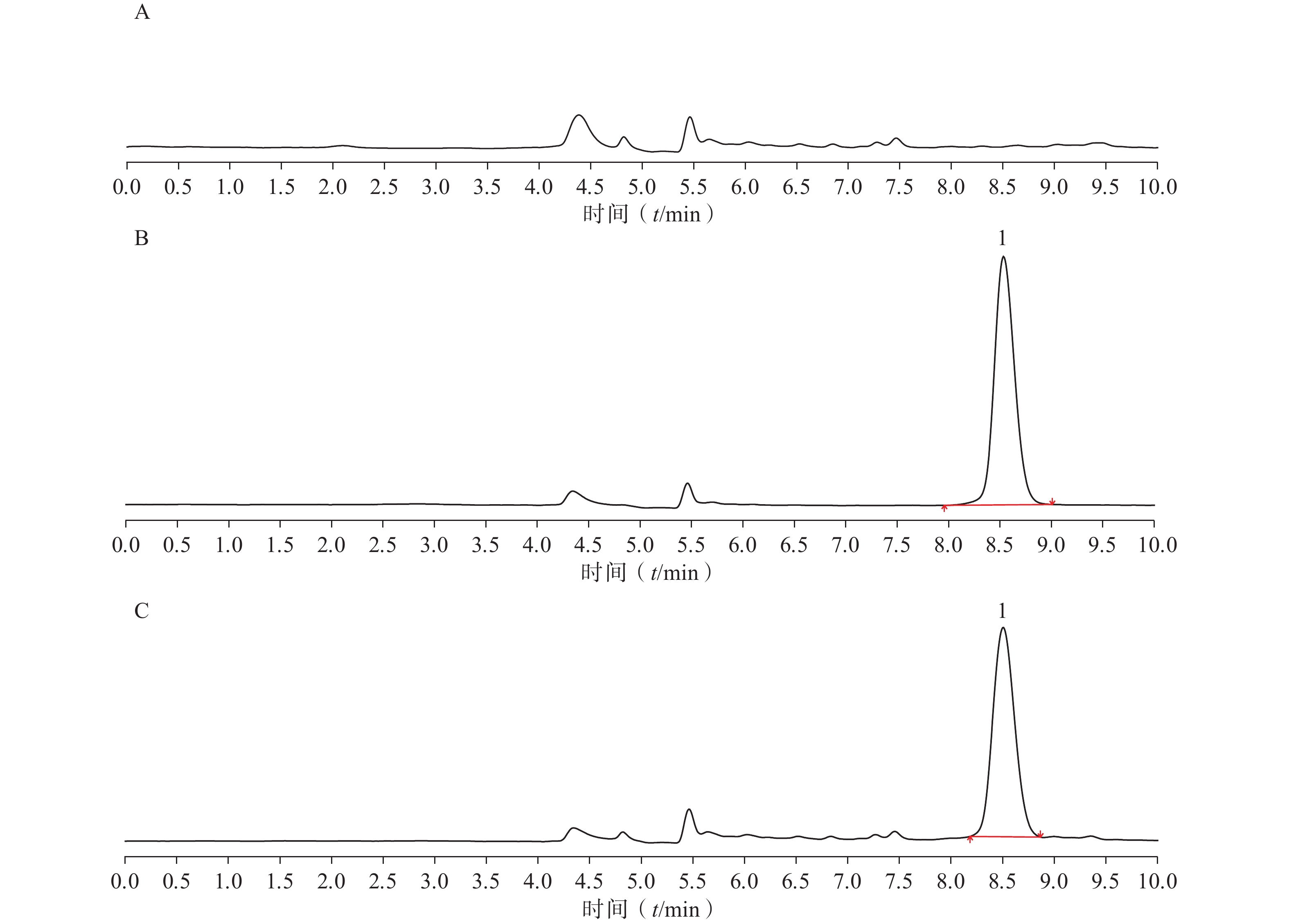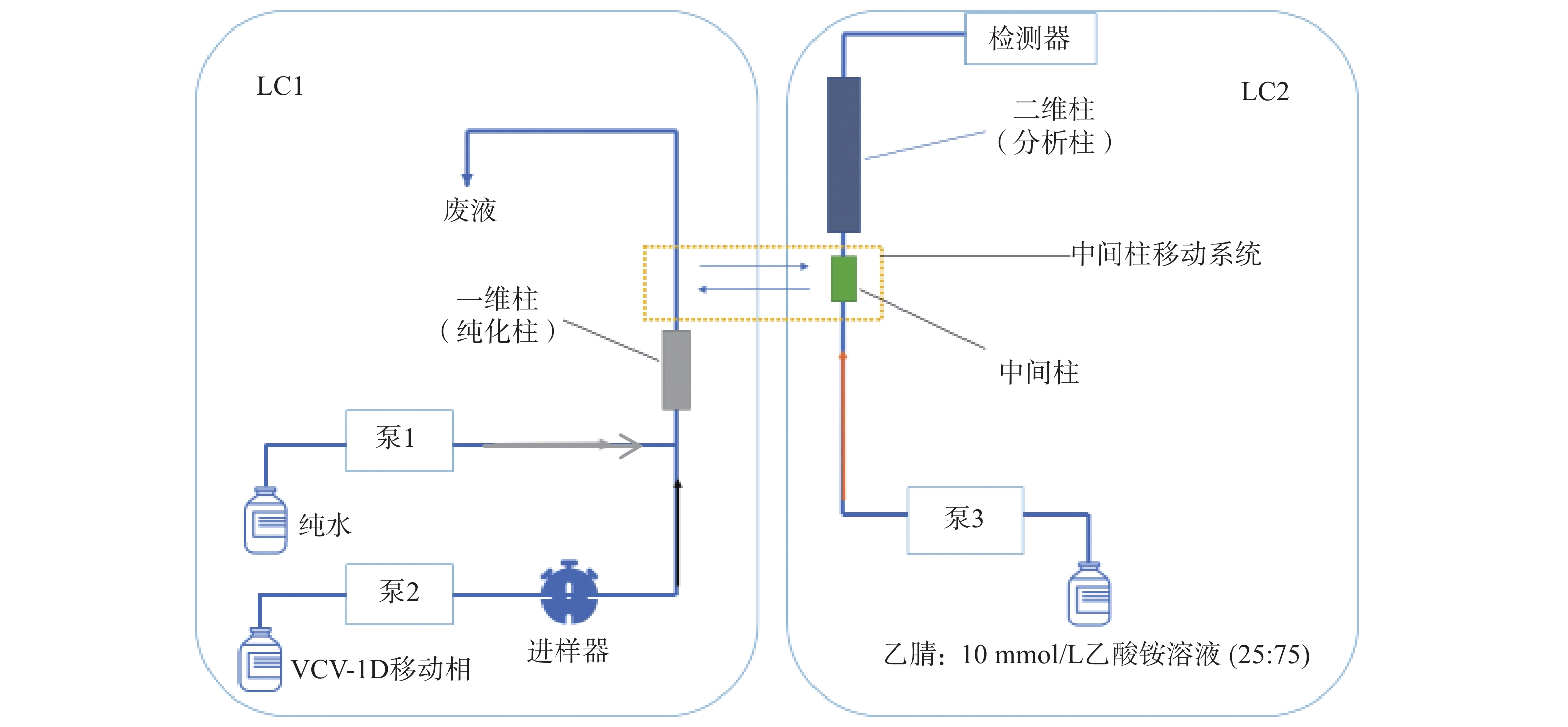 Objective To establish a central cutting two-dimensional liquid chromatography for the determination of lamotrigine in human plasma. Methods External standard method was used. The first dimensional chromatographic column: SNCB(T)-1A(silica gel, 4.6 mm×50 mm, 5 μm), mobile phase A:VCV-1D mobile phase, flow rate: 0.4 ml/min; mobile phase B: water, flow rate: 1.0 ml/min; second dimensional chromatographic column: Symmetry C18 (4.6 mm×250 mm, 5 μm), mobile phase: acetonitrile-10 mmol/L ammonium acetate solution(V/V=25∶75), flow rate: 1.0 ml/min; Intermediate column: SBX 4-MA(resin, 3.0 mm×10 mm, 5µm). The UV detection wavelength: 306 nm, the column temperature: 45 ℃, and the injection volume: 200 μl. Results The linear range of lamotrigine was 1.24-39.50 μg/ml, the lower limit of quantification was 1.24 μg/ml, the detection limit was 0.02 μg/ml, the intra-day precision RSD was less than 5%, the day-to-day precision RSD was less than 10%, the variation of intra-day accuracy ranged from 102.17% to 111.17%, and the daytime accuracy variation ranged from 99.80% to 107.31% the recovery RSD was less than 5%, and the variation range was 89.95% -96.16%. After 24 hours storage at room temperature, repeated freezing and thawing for 3 times and storage at −40 ℃ for 2 weeks, the ratio of the measured value/labeled value ranged from 87.01% to 115.88%. Conclusion In this study, a method with simple operation, good stability, high sensitivity and good reproducibility was established, which could be suitable for clinical monitoring of blood concentration of lamotrigine and provide reliable monitoring data support for clinical individualized medication guidance.