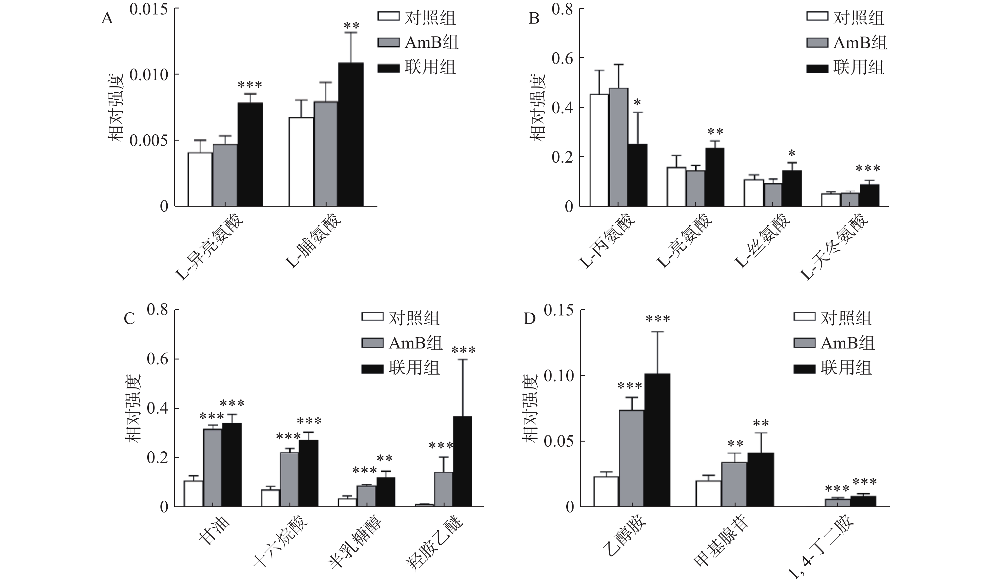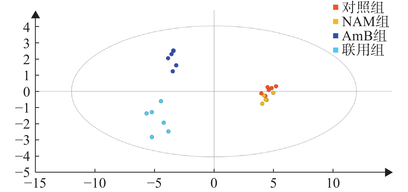 Objective To investigate the potential mechanism of nicotinamide combined with amphotericin B against Candida albicans based on metabolomics. Methods The intracellular metabolites of C. albicans intervened by different drugs including NAM, AmB, and their combination with a proper concentration were analyzed by gas chromatography-mass spectrometry. The differential metabolites were screened by multivariate statistical analysis and identified by searching the NIST database. Results Compared with the control group, the NAM intervention group was hardly separated from it, while the AmB group and NAM+AmB group showed a clear trend of separation. Under the intervention of AmB, 23 metabolites significantly changed compared with the control group, and 28 metabolites remarkably changed after NAM+AmB intervention, including amino acids, organic acids, sugars and other components. Conclusion NAM, as an endogenous metabolite of C. albicans, combined with AmB could enhance the effects of AmB in the original metabolic pathway and changed it to a certain extent. It was speculated that AmB combined with NAM may pose more antifungal effect on Candida albicans by regulating the tricarboxylic acid cycle, interfering with amino acid metabolism and influencing polyamine synthesis.