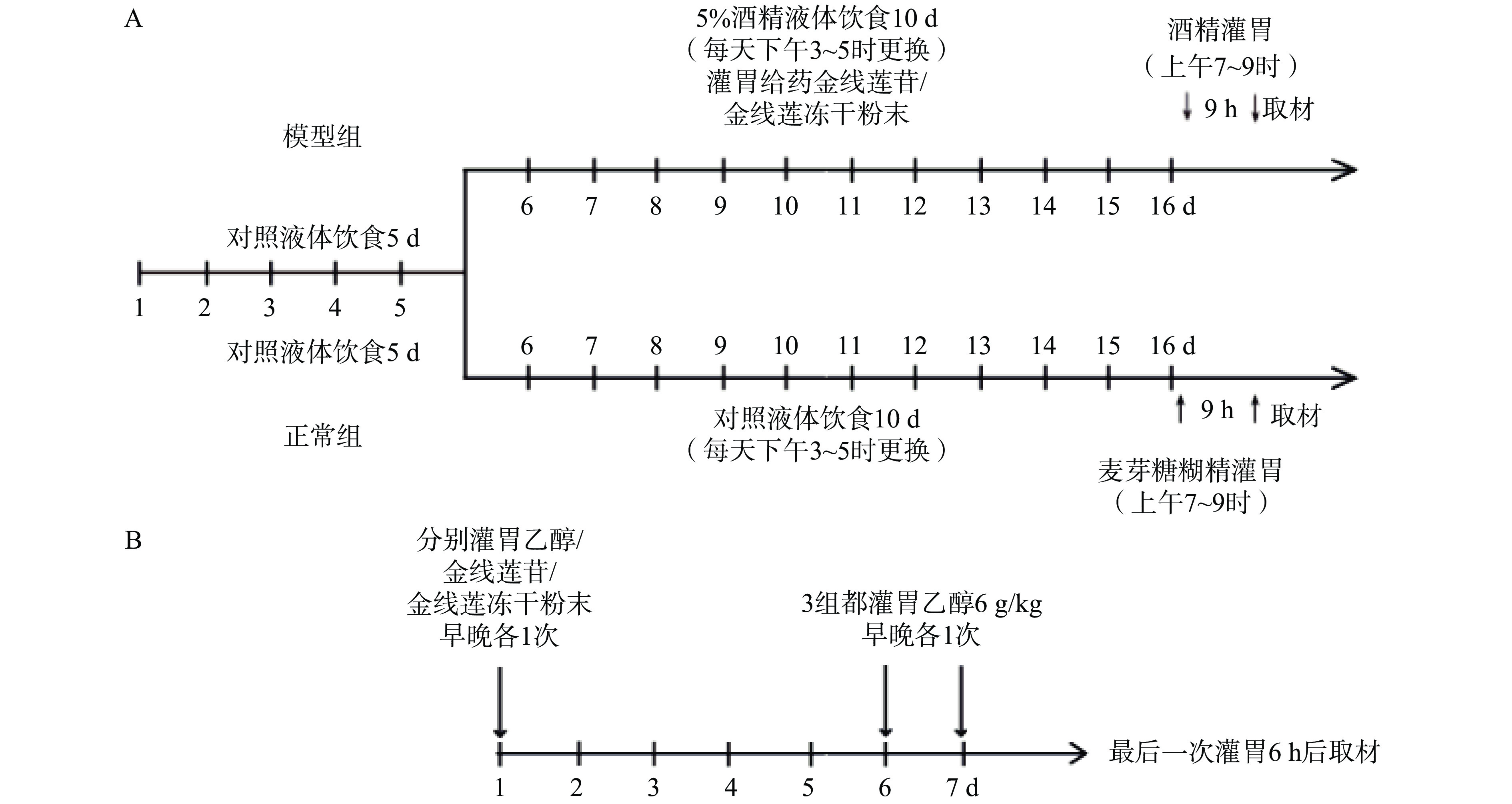 Objective To investigate the protective effect and potential mechanism of kinsenoside (KD)-the main ingredient of Anoectochilus roxburghii (AR) on alcoholic liver injury in mouse models of chronic and acute alcoholic liver injury, and provide a theoretical basis for the development of drugs for alcoholic liver injury. Methods Chronic and acute alcoholic liver injury mouse models were induced by feeding liquid diet containing 30% alcohol and gavage of high doses of alcohol (6 g/kg), respectively. The KD (50 mg/kg) and AR (250 mg/kg) were administrated by intragastric administration. Body weight, liver index, serum alanine aminotransferase (ALT), aspartate aminotransferase (AST) levels, serum total triglyceride (TG) and cholesterol (TC) levels were measured; hematoxylin-eosin and oil red O staining was performed on liver tissues; lipid metabolic related genes (PPARα and SREBP1) expression levels were detected by QPCR. Results Both models of alcoholic liver injury resulted in increased hepatic transaminase activity and elevated lipids, accompanied by massive vacuolar structure and lipid droplet formation in pathological liver sections. In the chronic alcoholic liver injury model, ALT and AST were significantly reduced after KD or AR treatment (P<0.05, P<0.001); the transcriptional activity of SREBP1 was significantly reduced after KD or AR treatment (P<0.01, P<0.05). In the acute alcoholic liver injury model, AST was significantly reduced after KD or AR treatment (P<0.01, P<0.01), and TG level was significantly decreased (P<0.01, P<0.01). Conclusion KD, as the main active ingredient of AR, played a major role in hepatoprotection in mice. KD treatment significantly alleviated chronic and acute alcoholic liver injury and reduced the lipid deposition in liver; KD promoted lipolysis by increasing PPARα and inhibiting the expression of SREBP1 to reduce the synthesis and accumulation of lipids, thus exerting its role in regulating lipid metabolism, which suggested that KD, as the active ingredient of AR, could be a potential drug for the treatment of ALD.