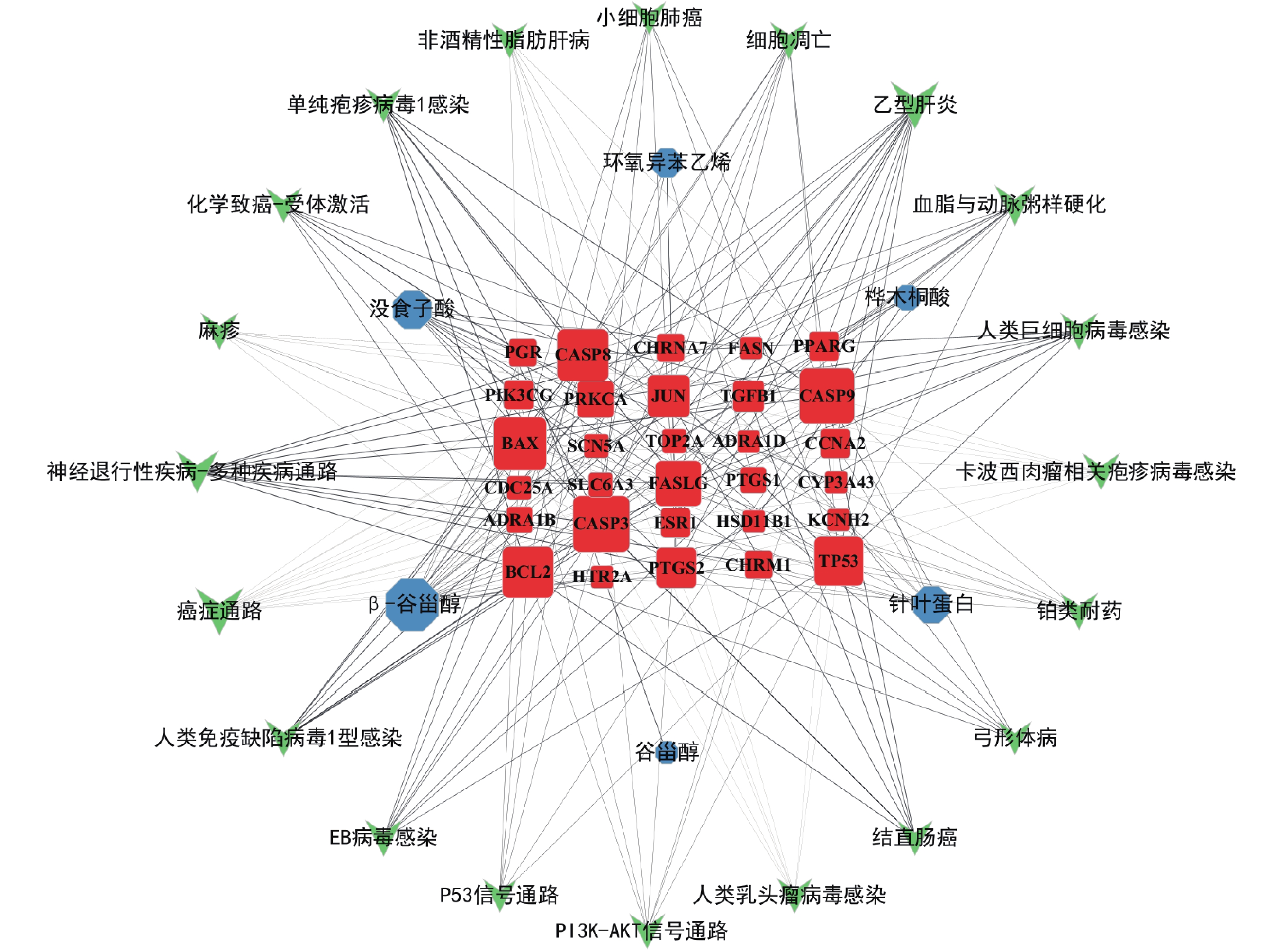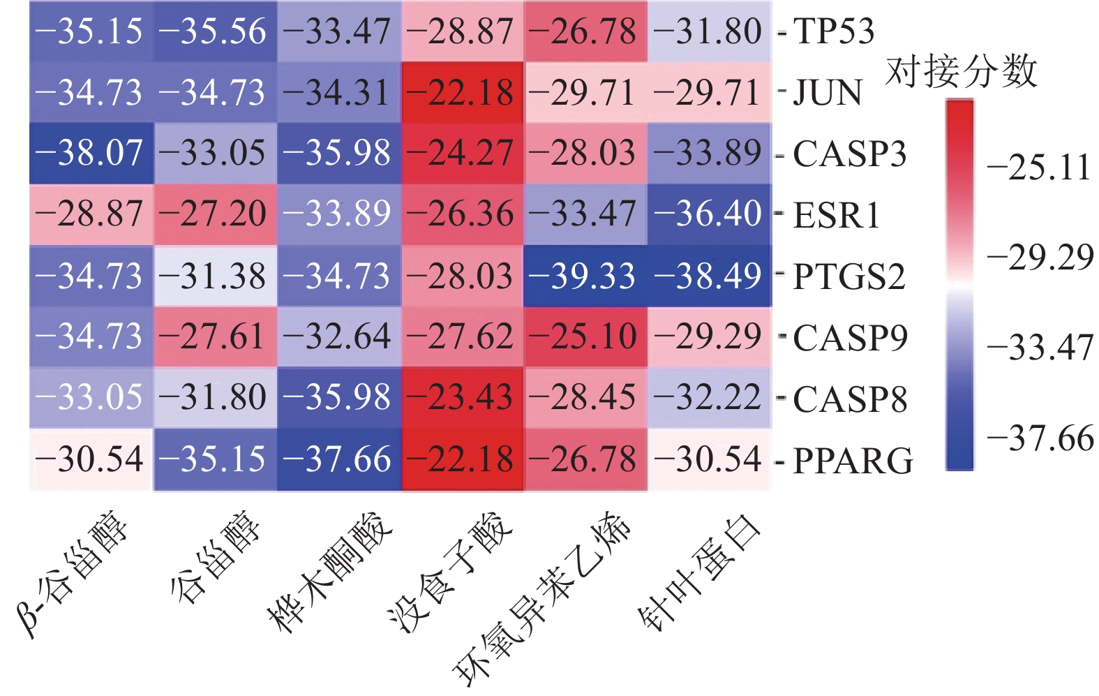 Objective To predict the active components and pharmacological mechanism of F.liquidambaris in the treatment of tumor based on the network pharmacology and molecular docking. Methods The active components of F.liquidambaris were obtained by literature mining and TCMSP database. The potential targets of the active components were predicted by SwissTargetPrediction. The related targets of tumor were screened through GeneCards, OMIM, TTD, DrugBank databases. The common target sites between F.liquidambaris and tumor were obtained after getting the intersection. Through the String database combined with cytoscape software, the treatment of tumor key targets were screened by network topology parameter analysis. In addition, Metascape database was used to perform the gene ontology enrichment analysis and Tokyo Encyclopedia Enrichment analysis of the key targets for the treatment of tumor, and “component-target-pathway” network diagram was constructed. Through AutoDock Vina software, the molecular docking between the active components and targets of F.liquidambaris was verified. Results 6 active components of F.liquidambaris,29 targets related to tumor were screened out. The results of network analysis showed that F.liquidambaris might play an anti-tumor role by acting on key targets such as TP53, JUN, CASP3, ESR1, PTGS2, CASP9, CASP8 and PPARG. By KEGG enrichment analysis, targets were mainly enriched in cancer pathway, apoptosis pathway,PI3K-Akt signaling pathway, colorectal cancer pathway, small cell lung cancer pathway, P53 signaling pathway and other related pathways, involving cellular response to organic cyclic compound, apoptosis signaling pathway, hematopoiesis and other biological processes. The results of molecular docking showed that key targets and active components could be docked well, the best docking was PTGS2-isostyracin epoxide. Conclusion This study preliminarily revealed that F.liquidambari had the advantages of multiple components, multiple targets and multiple pathways in the treatment of tumor, which provided a new idea and direction for the subsequent experimental research.
