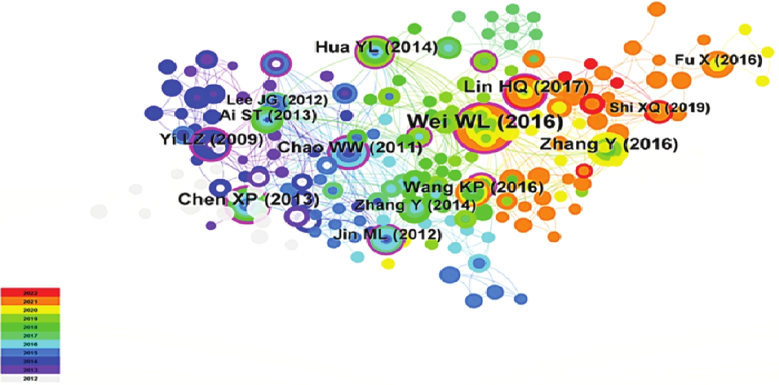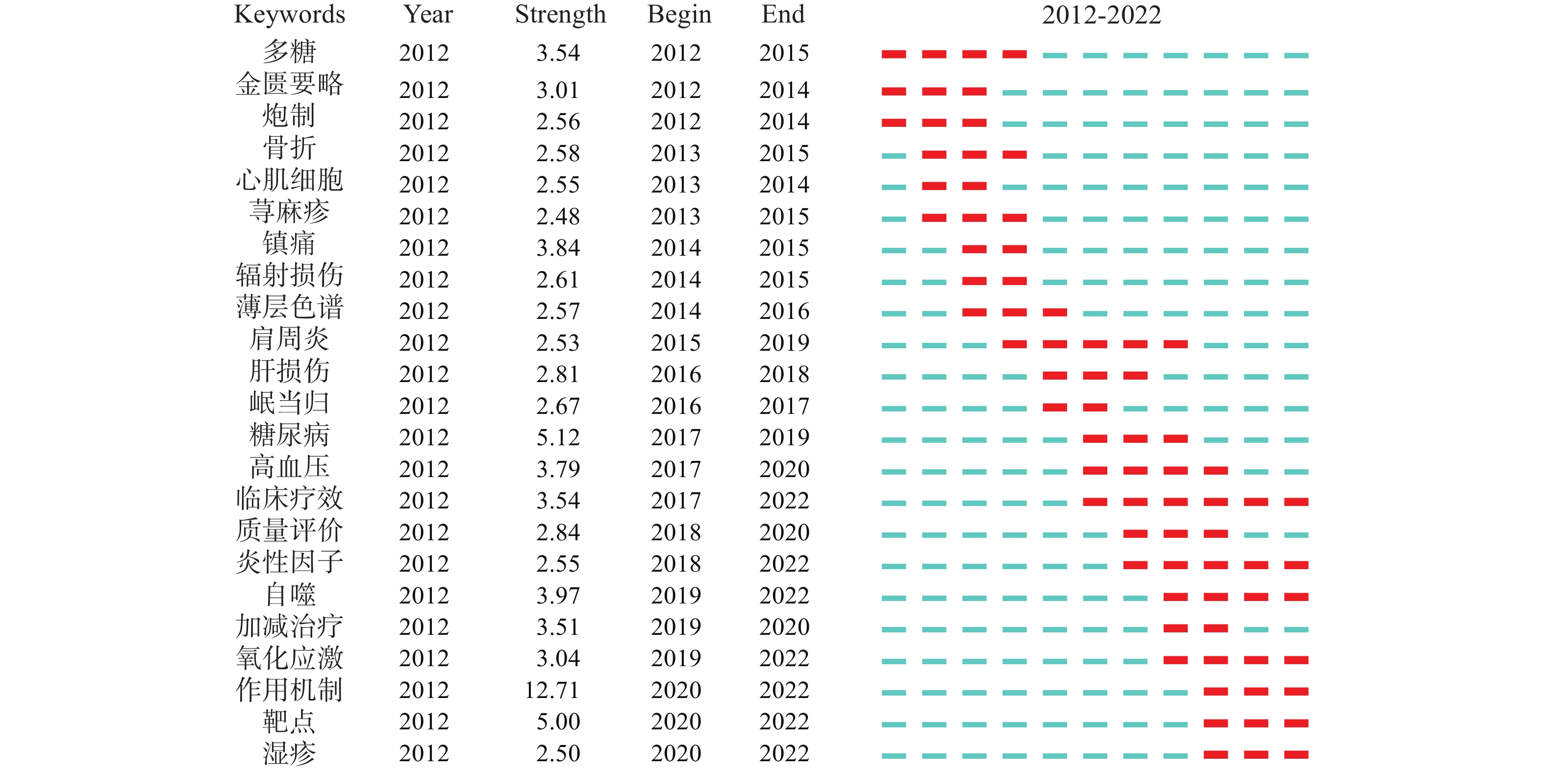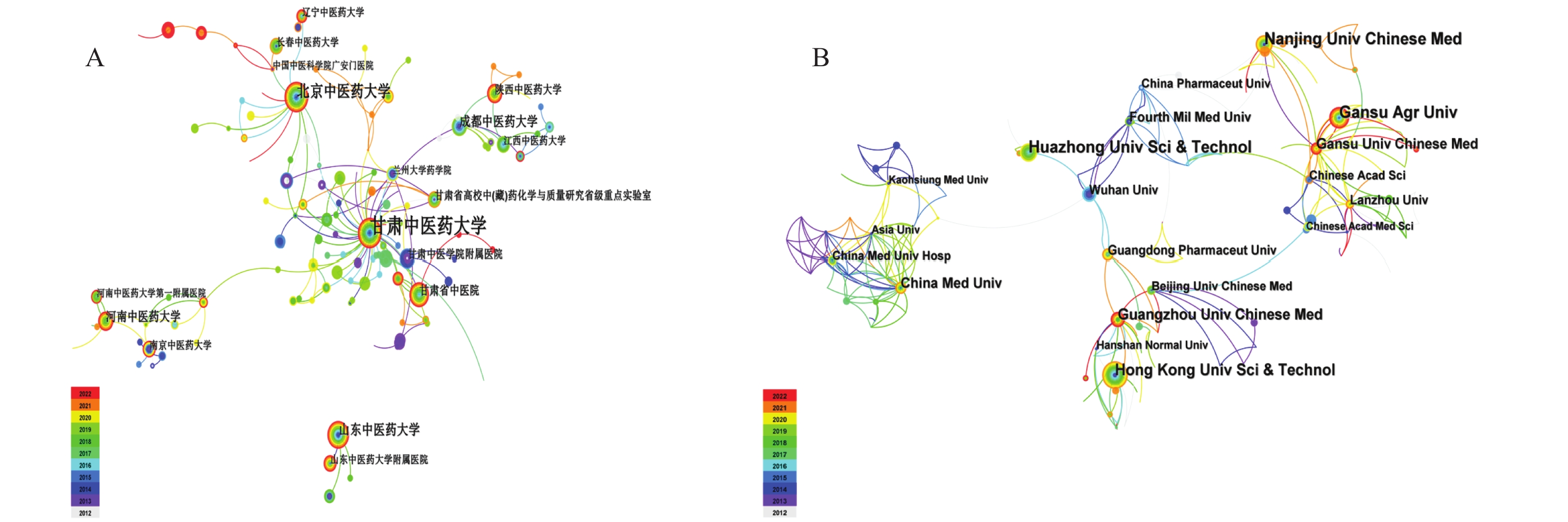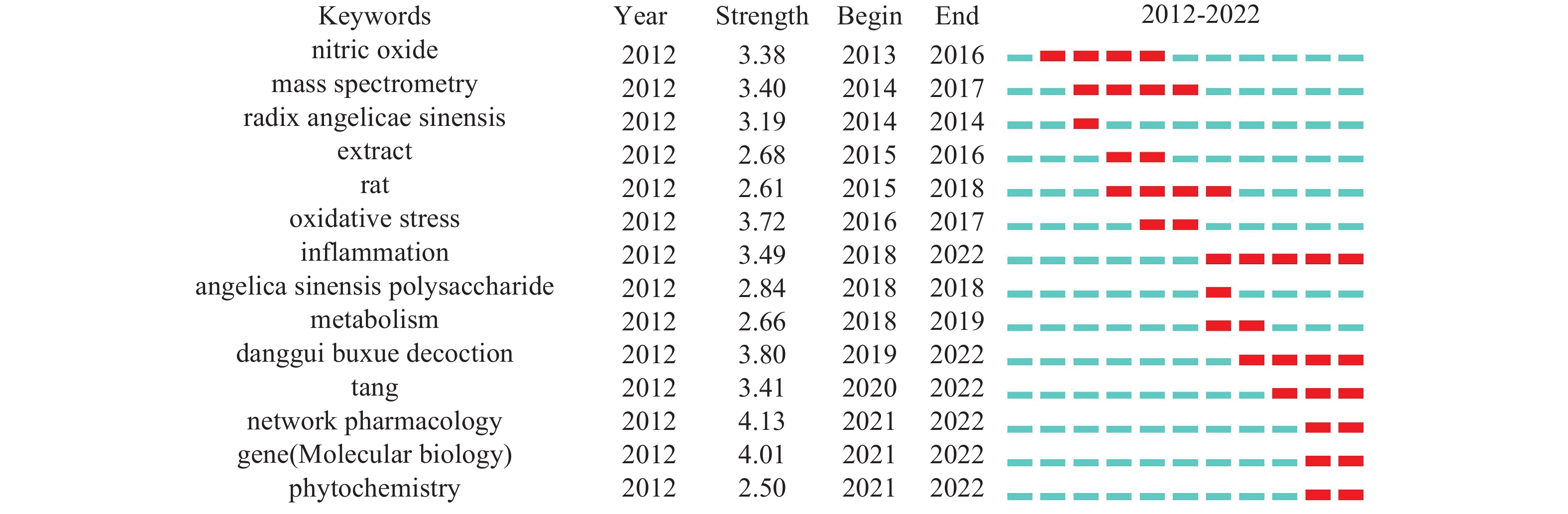 Objective Based on the visualization graph analysis of the research hotspots of Angelica sinensis, predict the future research trends, and provide references for the next step of Angelica sinensis research. Methods Chinese and English literatures on Angelica sinensis collected from CNKI, WanFang, VIP and Web of Science from 2012 to 2022 were retrieved. CiteSpace 6.1.R6 software was used to perform visualization econometrics analysis on the number of publications, authors, institutions, journals, keywords and other topics. Results 3490 Chinese literatures and 409 English literatures were included. Visual knowledge map analysis showed that Gansu University of Chinese Medicine and Nanjing University of Chinese Medicine were the research institutions with the largest number of literature publications in Chinese and English respectively. Journals published mainly include Shizhen Traditional Chinese Medicine and Materia medica, Evidence-based Complementary and Alternative Medicine. Current research hotspots include the effects of Angelica sinensis polysaccharides, volatile oils, and ferulic acid on the hematopoietic system, chronic diseases, and cognitive impairment, as well as clinical efficacy evaluations of classic prescriptions containing Angelica sinensis and their modified formulations. The research trend was characterized by a focus on the pharmacological study of Danggui Buxue Tang,employing various experimental approaches such as network pharmacology, serum pharmacology, and metabolomics to elucidate the mechanisms of Angelica sinensis. Conclusion The pharmacological effects of Angelica sinensis and its compound were extensive, which should be further researched.