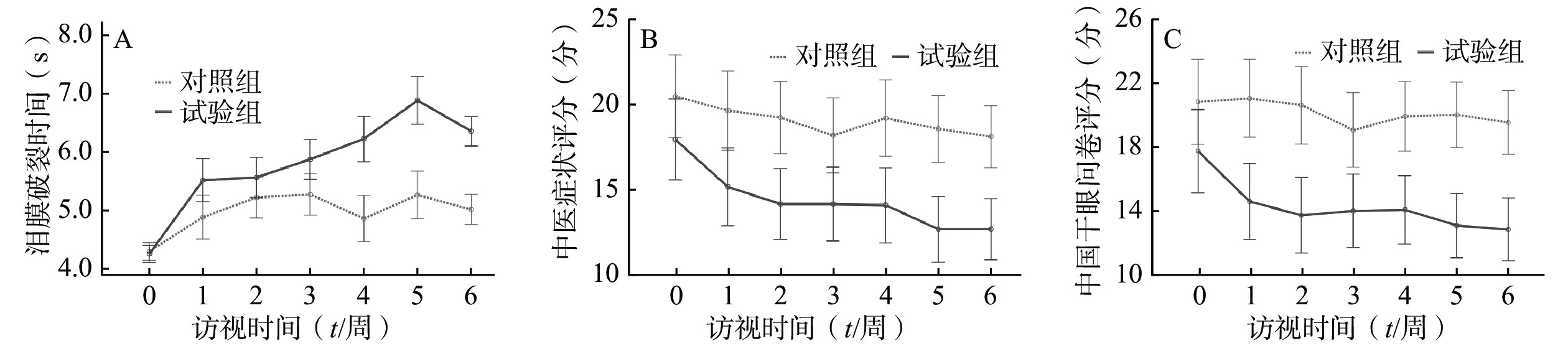 Objective To assess the clinical efficacy of sodium hyaluronate (0.3%) eye drops combined with herbal self-heating steam eye mask in the treatment of dry eye disease. Methods A prospective randomized controlled clinical trial was performed on 60 patients diagnosed with dry eye at the ophthalmic clinic of a Grade A, Class Ⅲ hospital in Shanghai from June 2023 to September 2024. Specifically, patients were randomly divided into control group and study group. Patients in the control group were treated with sodium hyaluronate (0.3%) eye drops for six weeks; while in the study group, patients received the eye drops combined with the herbal self-heating steam eye mask mainly containing powders of Flos Buddlejae. Subsequently, comparisons and analysis were performed before and after treatment between the two groups in the clinical symptom questionnaire score traditional Chinese medicine (TCM syndrome score), the Chinese dry eye questionnaire score and determination of tear film fluorscein breakup time (FBUT), and curative effect. Results The quality control standard of the herbal powder in the self-heating steam eye mask was established through TLC and HPLC, and good heating behavior of the herbal self-heating steam eye mask was ascertained heating temperature (43±5)℃; heating duration (≥20 min), meeting requirements of the product quality control. After treatment for 6 weeks, FBUT was increased, while TCM syndrome score and the Chinese dry eye questionnaire score were both decreased in the study group (P<0.001). Besides, compared with the control group, TCM syndrome score and the Chinese dry eye questionnaire score were much lower, while the FBUT were higher in the study group (P<0.001). Moreover, the overall response rate in the study group (81.7%) was much better than that in the control group (25.9%). Conclusion The combination of sodium hyaluronate (0.3%) eye drops with herbal self-heating steam eye mask could be applied to the clinical treatment of dry eye disease due to its good clinical effects on relieving dry eye symptoms.