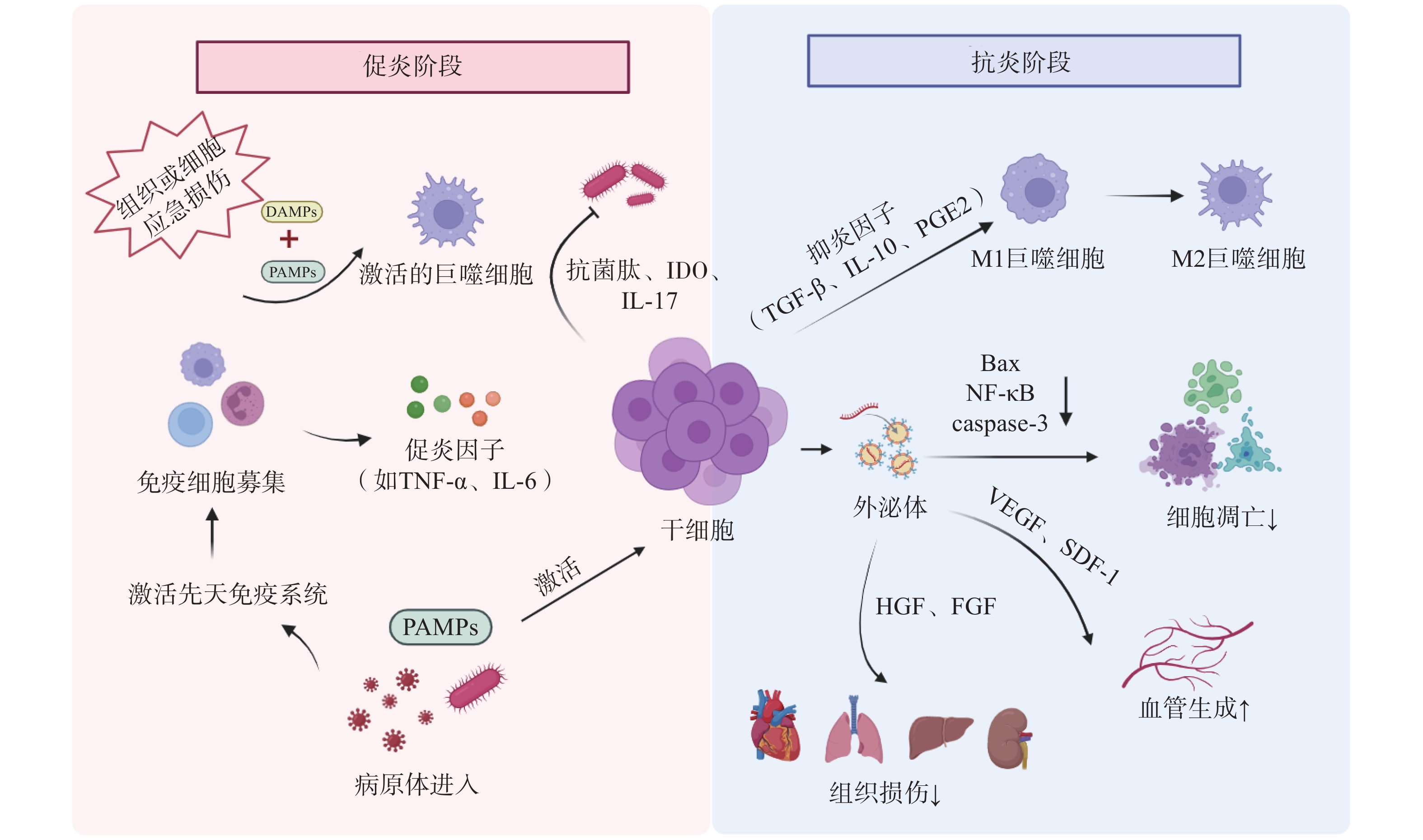 At present, the treatment of sepsis depends largely on non-specific methods, highlighting an urgent need for novel therapeutic strategies. Stem cells have garnered significant attention in the treatment of various diseases due to their unique biological properties. Stem cells enhance sepsis survival through mechanisms such as reducing bacterial burden, modulating inflammation, and ameliorating organ dysfunction. Recent studies have shown that stem cells can increase the survival rate of sepsis patients through multiple pathways such as reducing the bacterial load of the host, regulating inflammatory homeostasis, and improving multi-organ dysfunction. Their derivatives, exosomes, can also alleviate the imbalanced immune response in sepsis patients. Recent advances in stem cell-based therapies for sepsis were summarized in this paper.