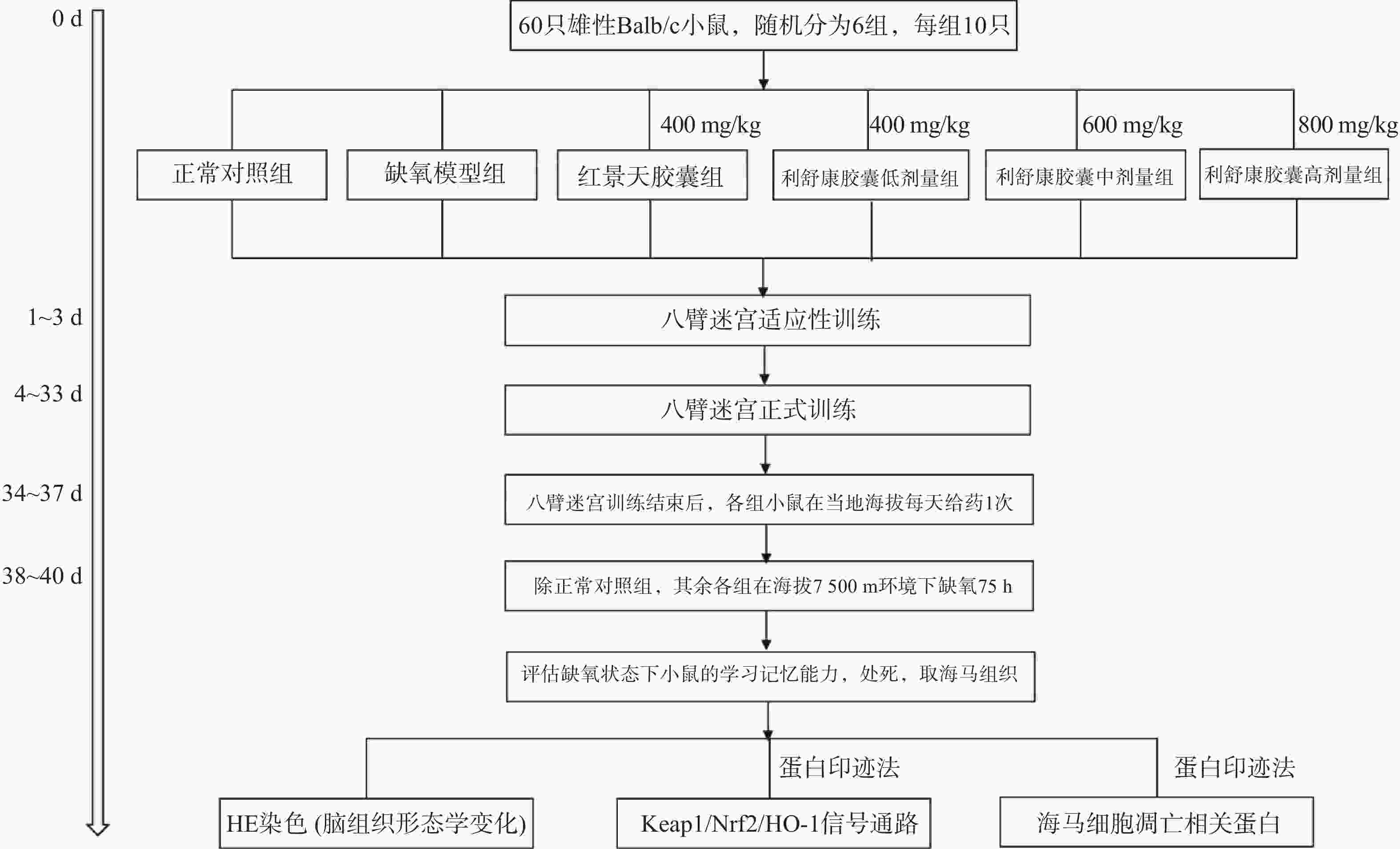 7500 m高度。之后每天上午实验员进入实验舱内(舱内海拔由7500 m降至3500 m,下降速度为20 m/s),在模拟海拔3 500 m处对小鼠进行灌胃给药,连续3 d。每天给药完毕后,将海拔上升至预定海拔7500 m处,小鼠在舱内自由进食和摄水,正常对照组小鼠同时饲养于动物实验科(当地海拔1500 m)。缺氧结束后将舱内海拔降至3500 m,实验人员进入舱内,检测高原损伤后小鼠的学习记忆能力,评价利舒康胶囊对高原学习记忆损伤的干预作用。实验流程如图1。实验结束后麻醉小鼠,取出海马组织,按照测定要求对其进行处理。 -