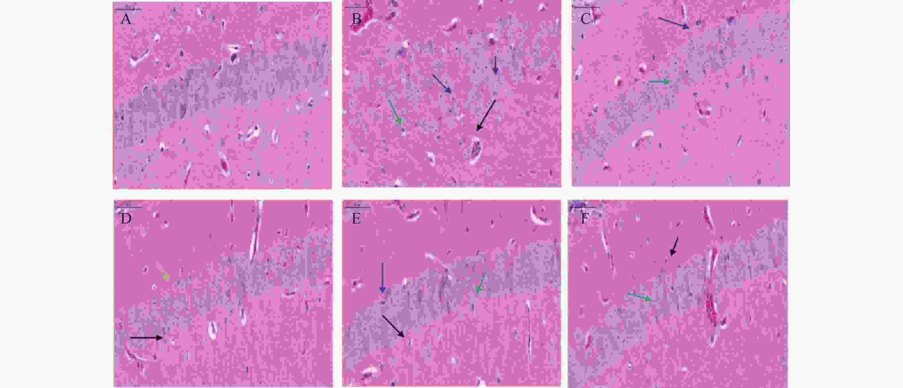 海马体在学习和记忆中发挥关键作用,尤其容易受到缺氧损伤。在本研究中,小鼠脑组织病理学切片结果显示(图2),正常对照组小鼠海马神经元密集,细胞核大而圆,神经元呈层状有序分布,各层细胞形态饱满而数量多,细胞排列整齐且致密;缺氧模型组小鼠海马神经元细胞分布受到破坏,细胞形态不规则,部分细胞缺失或有空泡(黑色箭头),出现明显核固缩(蓝色箭头),细胞排列紊乱,CA1区有较多不规则形状的深染细胞(绿色箭头),表明脑组织出现神经元死亡;经过红景天胶囊和利舒康胶囊药物干预后,缺氧模型组脑组织损伤有所改善;神经元细胞排列整齐,核固缩现象减轻(蓝色箭头),深染细胞数量减少(绿色箭头),少有细胞缺失或空泡(黑色箭头),细胞形态较好,排列整齐,且利舒康胶囊高剂量组脑组织形态趋于正常。