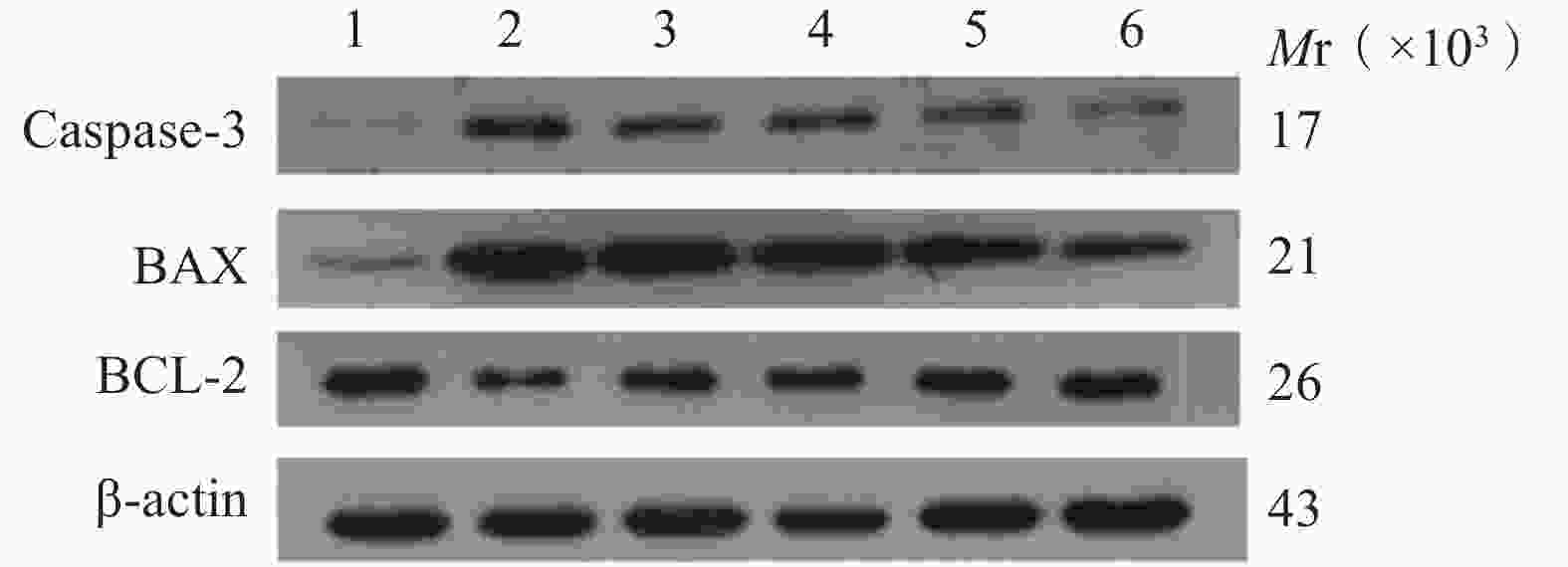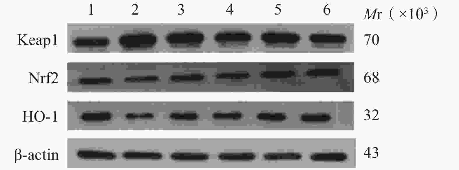将实验小鼠大脑取出,剖出海马体后,用BCA法测定其蛋白浓度,之后加入缓冲液,100 ℃水浴5 min,流水冷却后重复水浴5 min使其充分变性。以β-action为内参,配制10% SDS聚丙烯酰氨凝胶进行电泳、转膜和抗体孵育。次日使用ECL液进行显影,Image J图像分析软件对条带进行分析。一抗稀释比例为:β-action(1:2 000)、Keap1(1:1 000)、Nrf2(1:2 000)、HO-1(1:2 000)、Caspase-3(1:2 000)、Bax(1:1 000)、Bcl-2(1:1 000)。