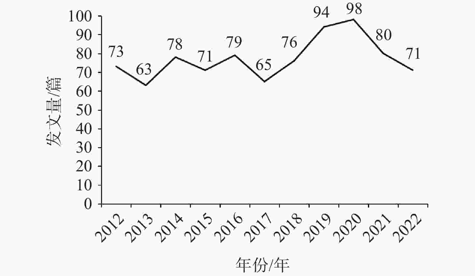 2012~2022年,三大数据库刊载的目标文献共计848篇。各年份具体发文量如图1所示。该领域文献发表数量整体呈阶段性增长趋势,其中2017~2020年增长速度较快,于2020年达到顶峰(98篇),近两年年发文量有所下降。